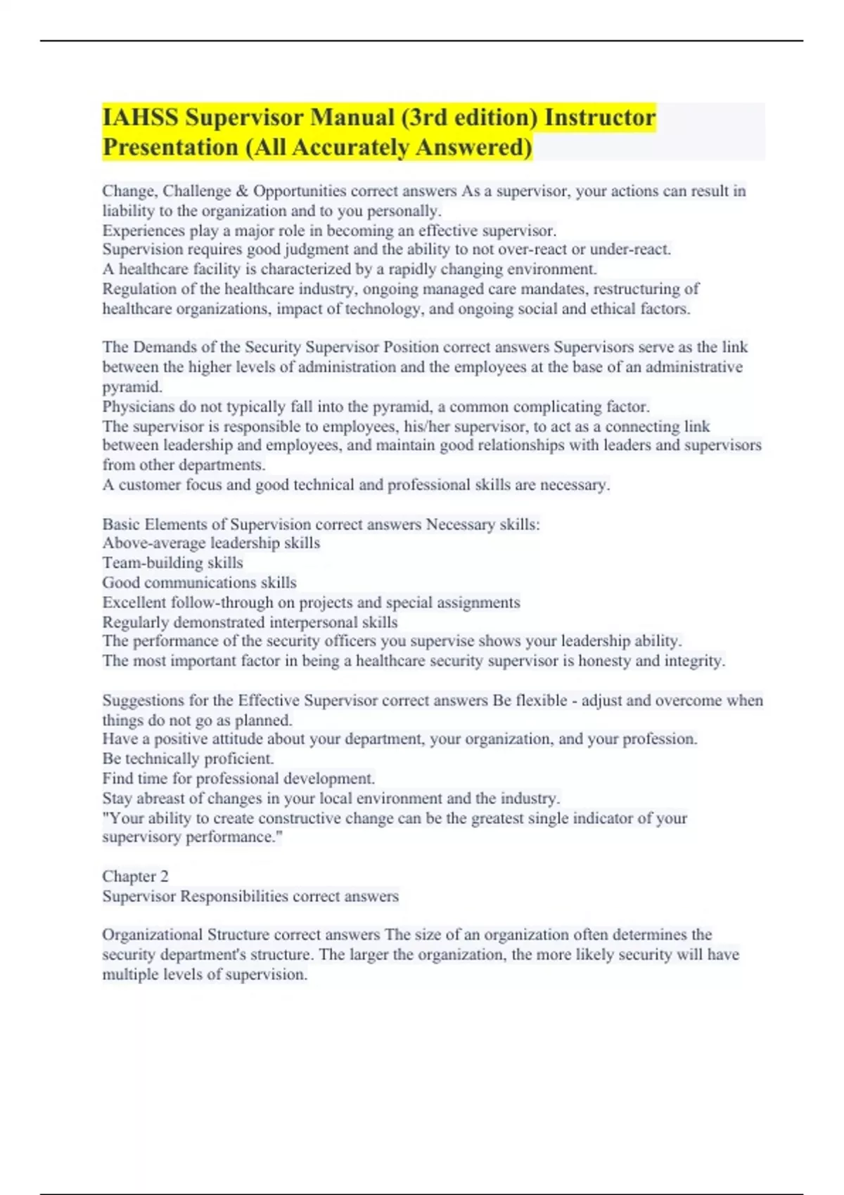 IAHSS Supervisor Manual (3rd edition) Instructor Presentation (All Accurately Answered)