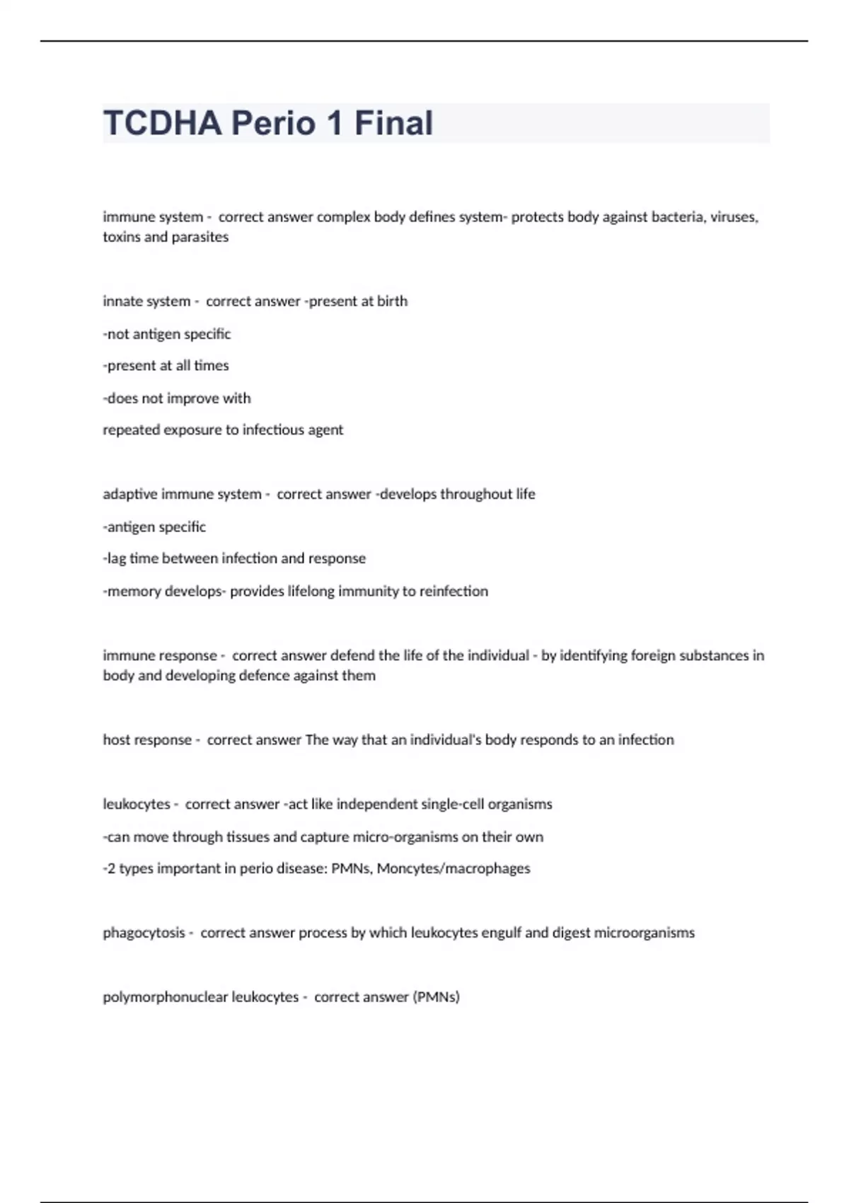 TCDHA Perio 1 Finalimmune system - correct answer complex body defines system- protects body against bacteria, viruses, toxins and parasites innate system - correct answer -present at birth -not antigen specific -present at all times -does not improve with repeated exposure to infectious agent adaptive immune system - correct answer -develops throughout life -antigen specific -lag time between infection and response -memory develops- provides lifelong immunity to reinfection immune response - correct answer defend the life of the individual - by identifying foreign substances in body and developing defence against them host response - correct answer The way that an individual's body responds to an infection leukocytes - correct answer -act like independent single-cell organisms -can move through tissues and capture micro-organisms on their own -2 types important in perio disease: PMNs, Moncytes/macrophages phagocytosis - correct answer process by which leukocytes engulf and digest microorganisms polymorphonuclear leukocytes - correct answer (PMNs) -neutrophils - rapid responders- 1st line of defence - capture/ destroy bacterial invaders -short-lived what attracts leukocytes to an infection site - correct answer PMNs are attracted to bacteria by chemotaxis lysosomes - correct answer strong bactericidal and digestive enzymes in PMN -perio pathogens are effectively destroyed by PMNs monocytes/macrophages - correct answer monocytes:in the bloodstream macrophages: in the tissues -slower to arrive at infection site than PMNs -surround/destroy bacteria -long-lived cells in chronic inflammation lymphocytes - correct answer small leukocytes- help defend body 2 types: B cells, t cells B lymphocytes - correct answer B Cells makes antibodies and pour into bloodstream 2 types: plasma/ memory b cells antibodies - correct answer y shaped proteins y binds w outside of b celll -other end of y binds to a MO and kills it