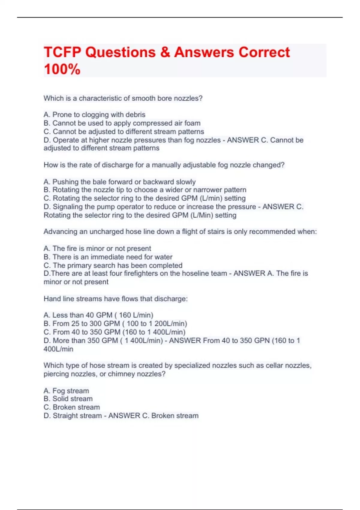 Which is a characteristic of smooth bore nozzles? A. Prone to clogging with debris B. Cannot be used to apply compressed air foam C. Cannot be adjusted to different stream patterns D. Operate at higher nozzle pressures than fog nozzles - ANSWER C. Cannot be adjusted to different stream patterns How is the rate of discharge for a manually adjustable fog nozzle changed? A. Pushing the bale forward or backward slowly B. Rotating the nozzle tip to choose a wider or narrower pattern C. Rotating the selector ring to the desired GPM (L/min) setting D. Signaling the pump operator to reduce or increase the pressure - ANSWER C. Rotating the selector ring to the desired GPM (L/Min) setting Advancing an uncharged hose line down a flight of stairs is only recommended when: A. The fire is minor or not present B. There is an immediate need for water C. The primary search has been completed D.There are at least four firefighters on the hoseline team - ANSWER A. The fire is minor or not present Hand line streams have flows that discharge: A. Less than 40 GPM ( 160 L/min) B. From 25 to 300 GPM ( 100 to 1 20
