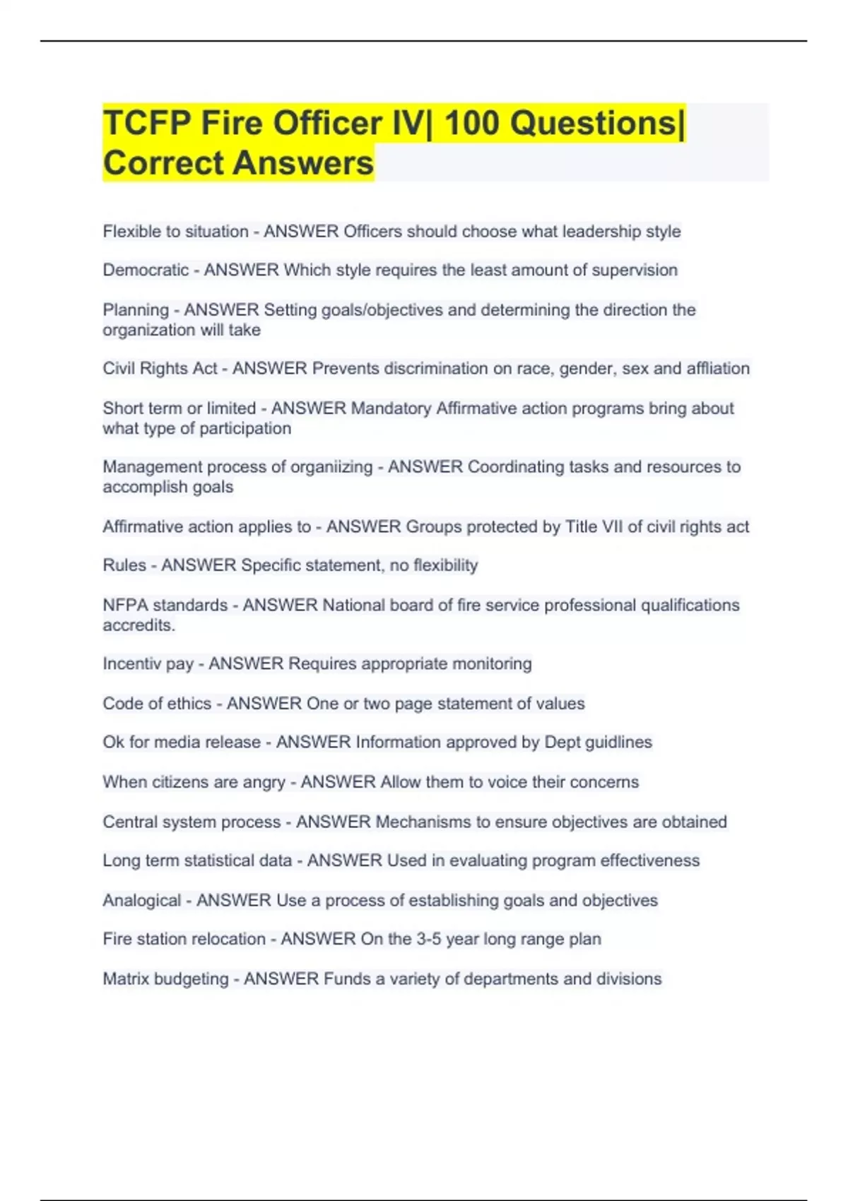 TCFP Fire Officer IV| 100 Questions| Correct Answers