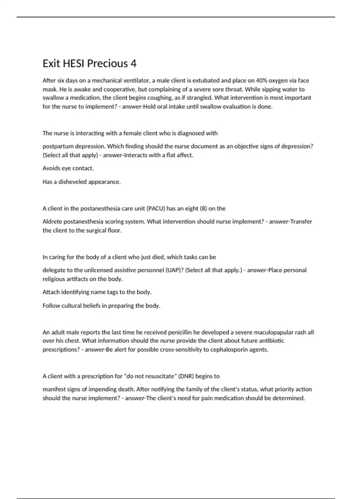 After six days on a mechanical ventilator, a male client is extubated and place on 40% oxygen via face mask. He is awake and cooperative, but complaining of a severe sore throat. While sipping water to swallow a medication, the client begins coughing, as if strangled. What intervention is most important for the nurse to implement? - answer-Hold oral intake until swallow evaluation is done. The nurse is interacting with a female client who is diagnosed with postpartum depression. Which finding should the nurse document as an objective signs of depression? (Select all that apply) - answer-Interacts with a flat affect. Avoids eye contact. Has a disheveled appearance. A client in the postanesthesia care unit (PACU) has an eight (8) on the Aldrete postanesthesia scoring system. What intervention should nurse implement? - answer-Transfer the client to the surgical floor. In caring for the body of a client who just died, which tasks can be delegate to the unlicensed assistive personnel (UAP)? (Select all that apply.) - answer-Place personal religious artifacts on the body. Attach identifying name tags to the body. Follow cultural beliefs in preparing the body.