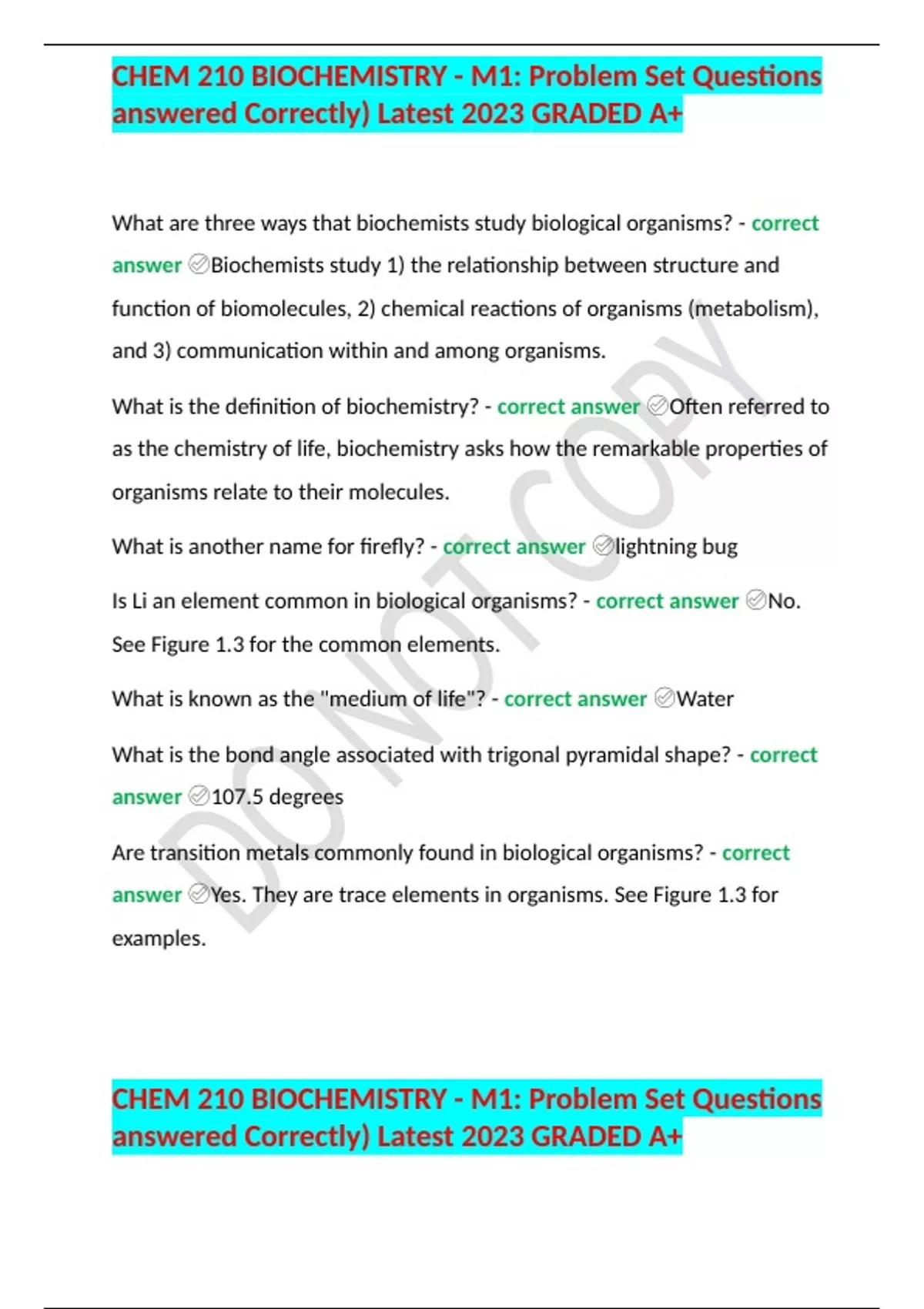 CHEM 210 BIOCHEMISTRY - M1: Problem Set Questions answered Correctly) Latest 2023 GRADED A+