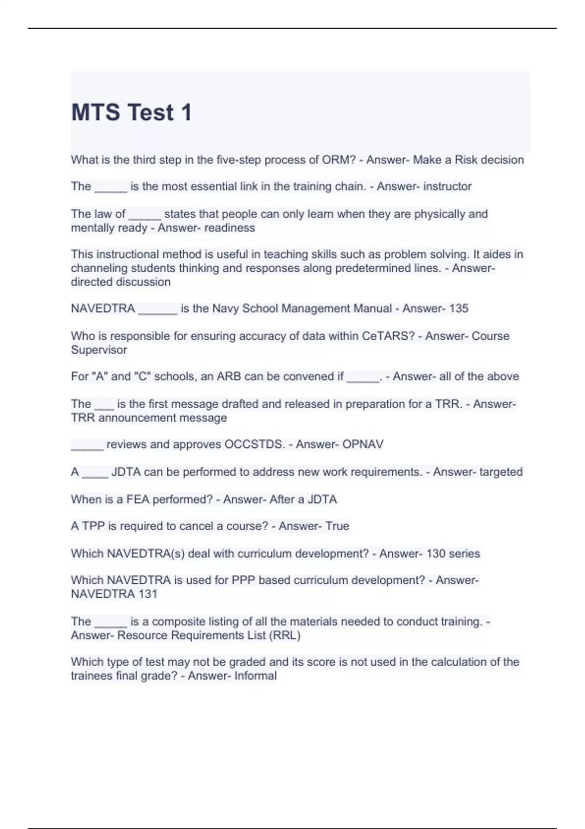 MTS Test 1 Questions and Answers 2023