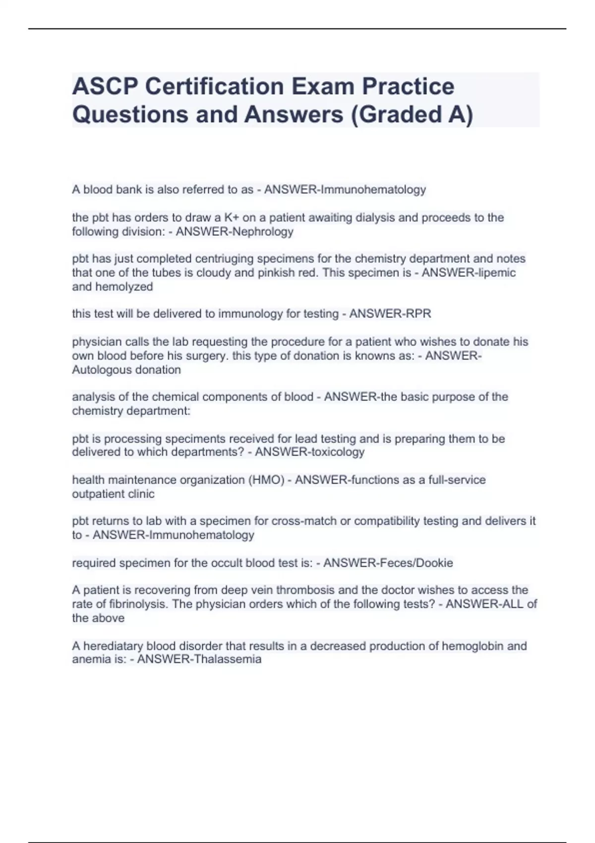 ASCP Certification Exam Practice Questions and Answers (Graded A) ASCP Certification Exam Practice Questions and Answers (Graded A) ASCP Certification Exam Practice Questions and Answers (Graded A) A blood bank is also referred to as - ANSWER-Immunohematology the pbt has orders to draw a K+ on a patient awaiting dialysis and proceeds to the following division: - ANSWER-Nephrology pbt has just completed centriuging specimens for the chemistry department and notes that one of the tubes is cloudy and pinkish red. This specimen is - ANSWER-lipemic and hemolyzed this test will be delivered to immunology for testing - ANSWER-RPR physician calls the lab requesting the procedure for a patient who wishes to donate his own blood before his surgery. this type of donation is knowns as: - ANSWER-Autologous donation analysis of the chemical components of blood - ANSWER-the basic purpose of the chemistry department: pbt is processing speciments received for lead testing and is preparing them to be delivered to which departments? - ANSWER-toxicology