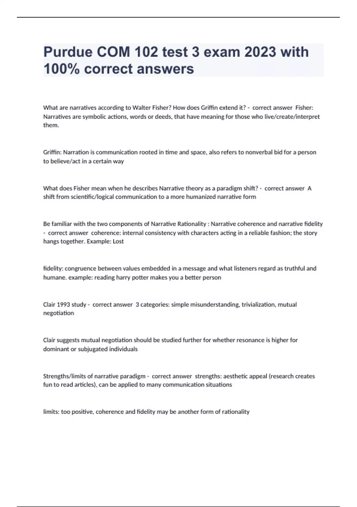 What are narratives according to Walter Fisher? How does Griffin extend it? - correct answer Fisher: Narratives are symbolic actions, words or deeds, that have meaning for those who live/create/interpret them. Griffin: Narration is communication rooted in time and space, also refers to nonverbal bid for a person to believe/act in a certain way What does Fisher mean when he describes Narrative theory as a paradigm shift? - correct answer A shift from scientific/logical communication to a more humanized narrative form Be familiar with the two components of Narrative Rationality : Narrative coherence and narrative fidelity - correct answer coherence: internal consistency with characters acting in a reliable fashion; the story hangs together. Example: Lost fidelity: congruence between values embedded in a message and what listeners regard as truthful and humane. example: reading harry potter makes you a better person Clair 1993 study - correct answer 3 categories: simple misunderstanding, trivialization, mutual negotiation Clair suggests mutual negotiation should be studied further for whether resonance is higher for dominant or subjugated individuals Strengths/limits of narrative paradigm - correct answer strengths: aesthetic appeal (research creates fun to read articles), can be applied to many communication situations limits: too positive, coherence and fidelity may be another form of rationality Accordin