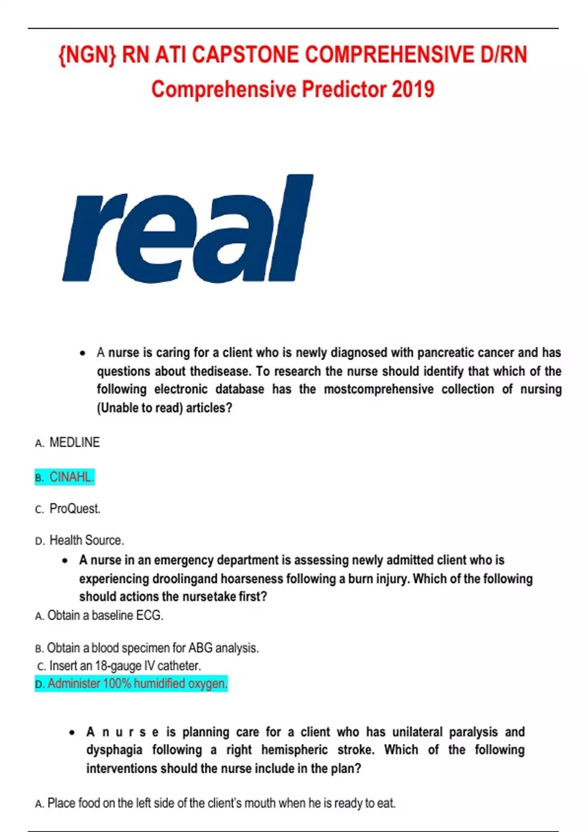 {NGN} RN ATI CAPSTONE COMPREHENSIVE D/RN Comprehensive Predictor 2019 A nurse is caring for a client who is newly diagnosed with pancreatic cancer and has questions about thedisease. To research the nurse should identify that which of the following electronic database has the mostcomprehensive collection of nursing (Unable to read) articles? A. MEDLINE B. CINAHL. C. ProQuest. D. Health Source. A nurse in an emergency department is assessing newly admitted client who is experiencing droolingand hoarseness following a burn injury. Which of the following should actions the nursetake first? A. Obtain a baseline ECG. B. Obtain a blood specimen for ABG analysis. C. Insert an 18-gauge IV catheter. D. Administer 100% humidified oxygen.