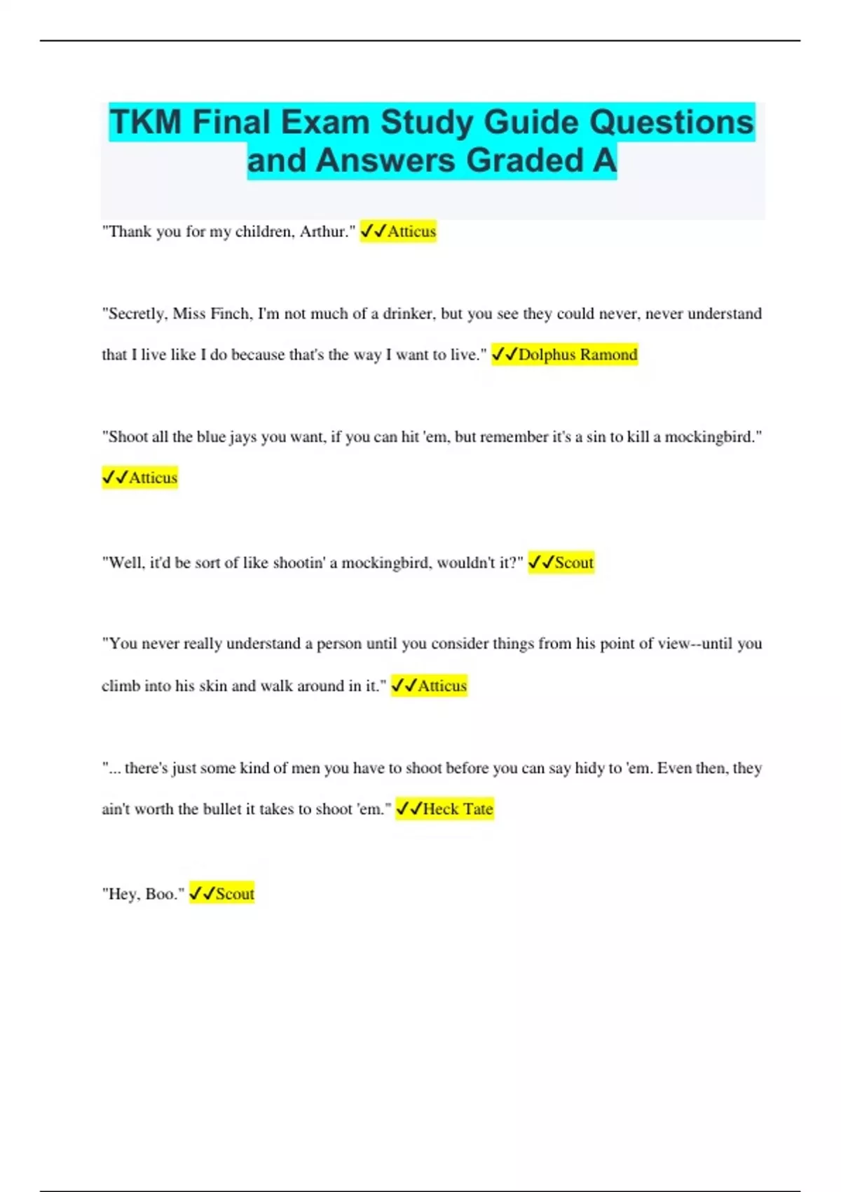 TKM Final Exam Study Guide Questions and Answers Graded A