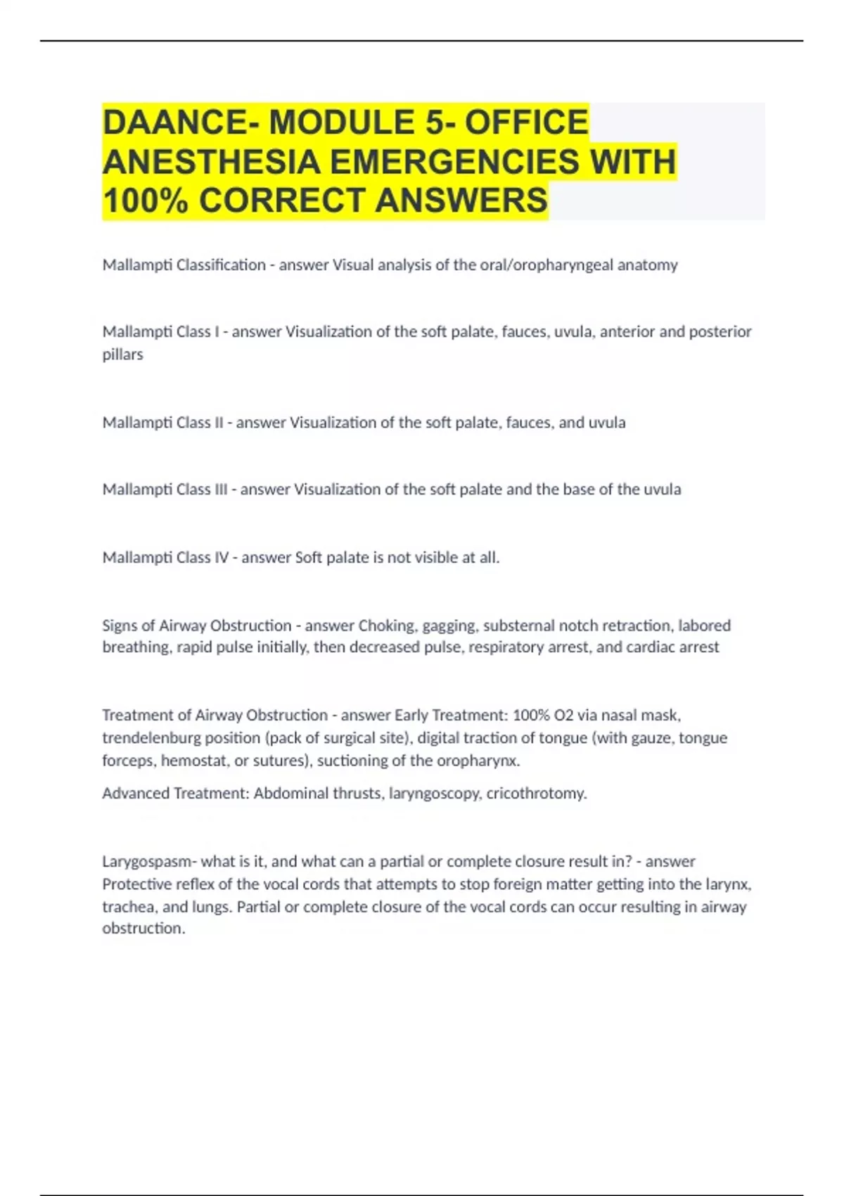 DAANCE- MODULE 5- OFFICE ANESTHESIA EMERGENCIES WITH 100% CORRECT ANSWERS