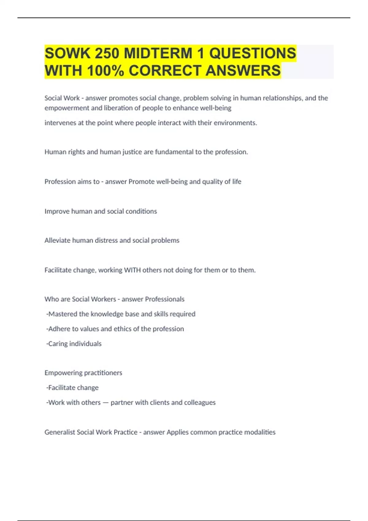 Social Work promotes social change, problem solving in human relationships, and the empowerment and liberation of people to enhance well-being intervenes at the point where people interact with their environments. Human rights and human justice are fundamental to the profession. Profession aims to Promote well-being and quality of life Improve human and social conditions Alleviate human distress and social problems Facilitate change, working WITH others not doing for them or to them. Who are Social Workers Professionals -Mastered the knowledge base and skills required -Adhere to values and ethics of the profession -Caring individuals Empowering practitioners -Facilitate change -Work with others — partner with clients and colleagues Generalist Social Work Practice Applies common practice modalities Sees the potential for change at various levels Views human behavior in the social environment Integrates direct practice with social policy and research Generalist practitioners Are able to work with many systems Work with client systems at all levels Work with organizations Advocate for social change Refer clients to available and needed resources Research social work practice Purpose of SOWK "enhance human wellbeing and help meet the basic human needs of all people, with particular attention to the needs and empowerment of people who are vulnerable, oppressed, and living in poverty" (NASW Code of Ethics, 2008, p. 1). SOWK Goals/Purpose Enhance social functioning Link client systems with resources Improve the functioning of social service delivery Promote social justice by developing social policy Human strengths -Building blocks of social work practice. -Starting point for generating solutions Human needs -Motivation for social work activities Sources of needs and strengths Universal basic needs -Physical, intellectual, emotional, social, and spiritual growth. Motivational needs - Maslow's hierarchy of needs (1970) Personal development -Biological, physiological, interpersonal, social, and cultural factors. Life tasks - Life demands Physical environment - Space Social justice and human rights - equity, freedoms, rights World living - universal context, mutual dependence Cultural strengths - diversity from membership in multiple groups Identity Development Critical thinking: identity development -Erikson, Kohlberg, Levinson presume men and women have similar developmental needs through childhood. -But they determine maturity of men and women differently -Masculine: based on autonomy and individuation -Feminine: based on imitate relationships What do you think about this? As future social workers, researchers and theorists what do we need to consider? What do we need to do? Fields of Practice Family Services Child protective services Health care Occupational social work Gerontological social work School social work Criminal justice Information and referral Community organizing Mental health Policy Advocacy Social institutions address the needs of citizens and aim to resolve social problems. Social Welfare is a social institution -Provide services needed by all people at some point in their lives. -Provide supports that enable us to sustain or maintain social functioning. -Respond to the needs of members of society for health, education, economic, and social well-being. Social Welfare functions Residual view Institutional view: Social welfare benefits the total population, not only a specific group. ***ISSUE: Status and power/privilege allow some in society to define "needs" and how they should be addressed. residual view of social welfare Welfare applies only when other support systems break down. Institutional view of social welfare Welfare is an integrated part of a modern society that provides services to all who need them. Two sociological views Consensus/structural functionalist model conflict model Consensus/Structural Functionalist Model Seeks balance between society and its members. The goal is to "control disruptive citizens and reform dysfunctional social structures" (DuBois & Miley p. 20). Social workers resolve conflicts, re-socialize those considered deviant, and seek balance between people and their environment. Conflict model Focuses on power Lack of equality in the distribution of power and authority leads to social problems. Social workers using this model get involved in confronting injustice and advocating for the needs of oppressed and vulnerable groups. The goal is to change the way power and authority are distributed in society. Relationship btw social work and society Four possible relationships: -Agent of social control on behalf of society -A reformer of society -Separate from society -Intermediary between individuals and society (Cowger, 1977) Empowerment "The process of increasing personal, interpersonal, or political power so that individuals can take action to improve their situations" (Gutiérrez, 2001, p. 210). suggests individual determination and democratic participation. helping clients "gain access to power in themselves, in and with each other, and in the social, economic, and political environments" (Lee, 2001, p. 26) Social work as an empowering profession For empowerment to work people must have options—access to resources. ***Empowerment does not mean that power for one needs to decrease in order for power of another to increase. Common elements of Empowerment Focus on strengths Work collaboratively WITH clients, not for clients (they know best and will do what they want!) Reflect on structural systems and barriers to resources from their perspective Link personal and political power: -"Empowerment links two main sources of power---personal power and political power. -Personal power involves an individual's ability to control his/her destiny and influence his/her surroundings. -Political power is the ability to alter systems, redistribute resources, open up opportunity structures and reorganize society (Lee, 2001 as cited in Dubois and Miley, 2014, p