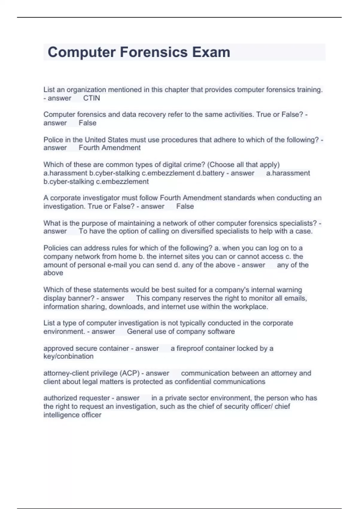 Computer Forensics Exam Questions and Answers 2023 Verified