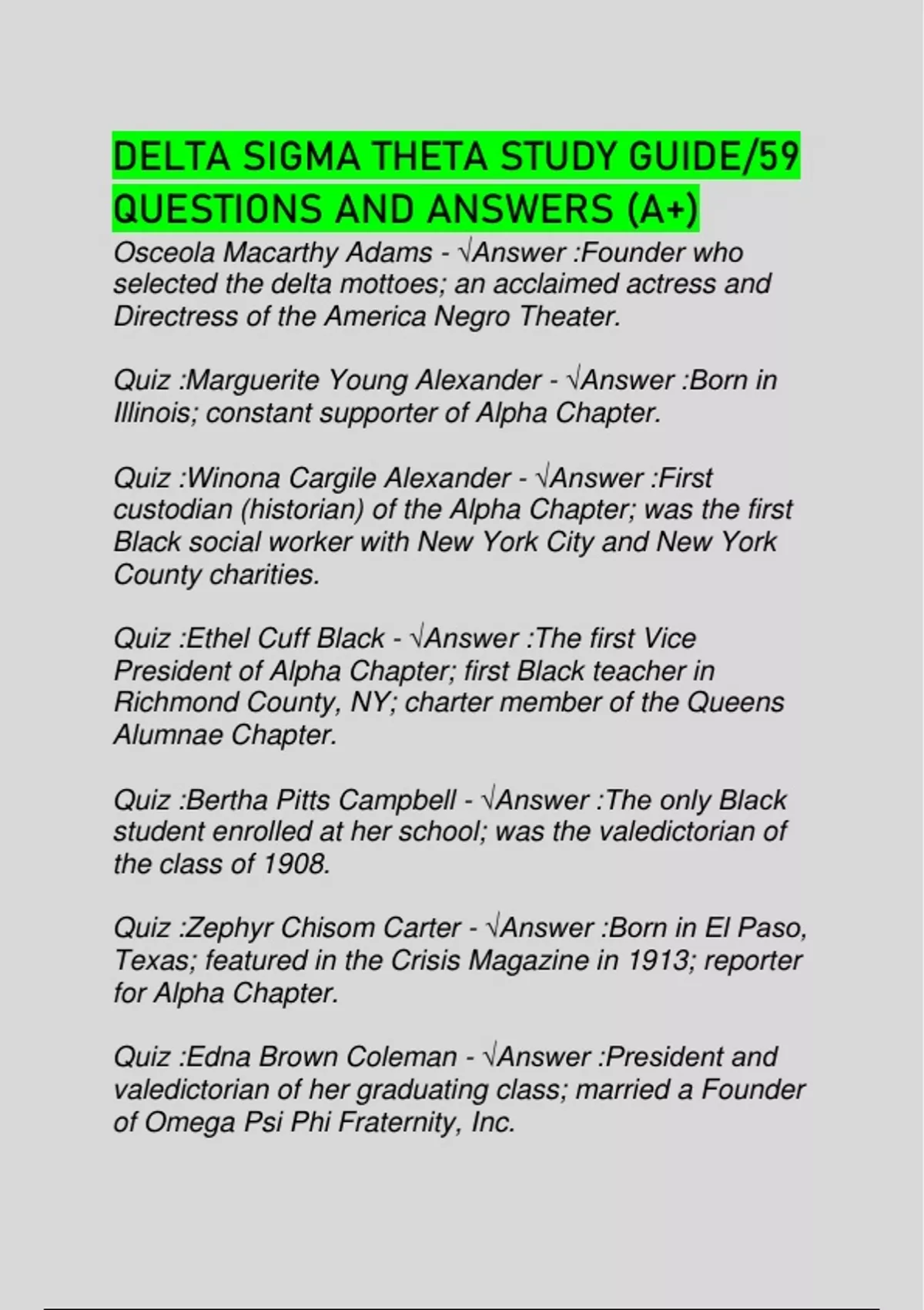 DELTA SIGMA THETA STUDY GUIDE/59 QUESTIONS AND ANSWERS (A+)