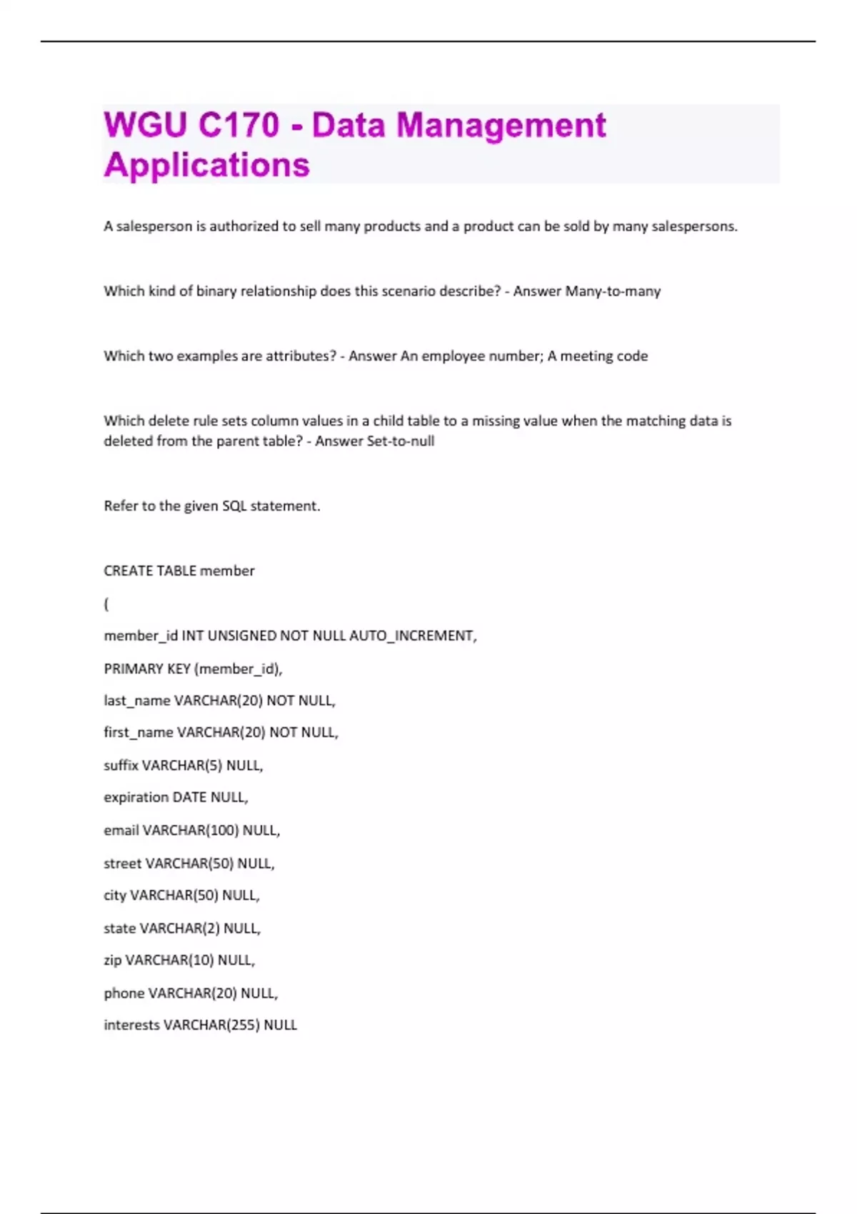 A salesperson is authorized to sell many products and a product can be sold by many salespersons. Which kind of binary relationship does this scenario describe? - Answer Many-to-many Which two examples are attributes? - Answer An employee number; A meeting code Which delete rule sets column values in a child table to a missing value when the matching data is deleted from the parent table? - Answer Set-to-null Refer to the given SQL statement. CREATE TABLE member ( member_id INT UNSIGNED NOT NULL AUTO_INCREMENT, PRIMARY KEY (member_id), last_name VARCHAR(20) NOT NULL, first_name VARCHAR(20) NOT NULL, suffix VARCHAR(5) NULL, expiration DATE NULL, email VARCHAR(100) NULL, street VARCHAR(50) NULL, city VARCHAR(50) NULL, state VARCHAR(2) NULL, zip VARCHAR(10) NULL, phone VARCHAR(20) NULL, interests VARCHAR(255) NULL); Which two columns are created as something other than variable-length strings in this statement? - Answer member_id; expiration Employee_ID Employee_Name Office_Address 12342 Jacob 54123 Main Street 12346 Michael 354 Center Avenue 12846 Ethan 54123 Main Street 12887 Joshua 54123 Main Street 12894 Daniel 354 Center Avenue 13097 Alexander 354 Center Avenue 13112 Anthony 54123 Main Street 13411 William 354 Center Avenue 13987 Christopher 354 Center Avenue 13998 Matthew 54123 Main Street This database table has ten different employee numbers in the first column. Employee_ID is the primary key. In addition, it has ten different names in the second column and two office addresses repeated five times each in the third column. Which action should be used to translate this data into third normal form? - Answer Move the data from the third column into its own table A database manager starts to convert data that has been normalized into a form that conforms to the relational model. A simple primary key has been established and all the repeating groups have been deleted. In which form is this data? - Answer Second Normal Form