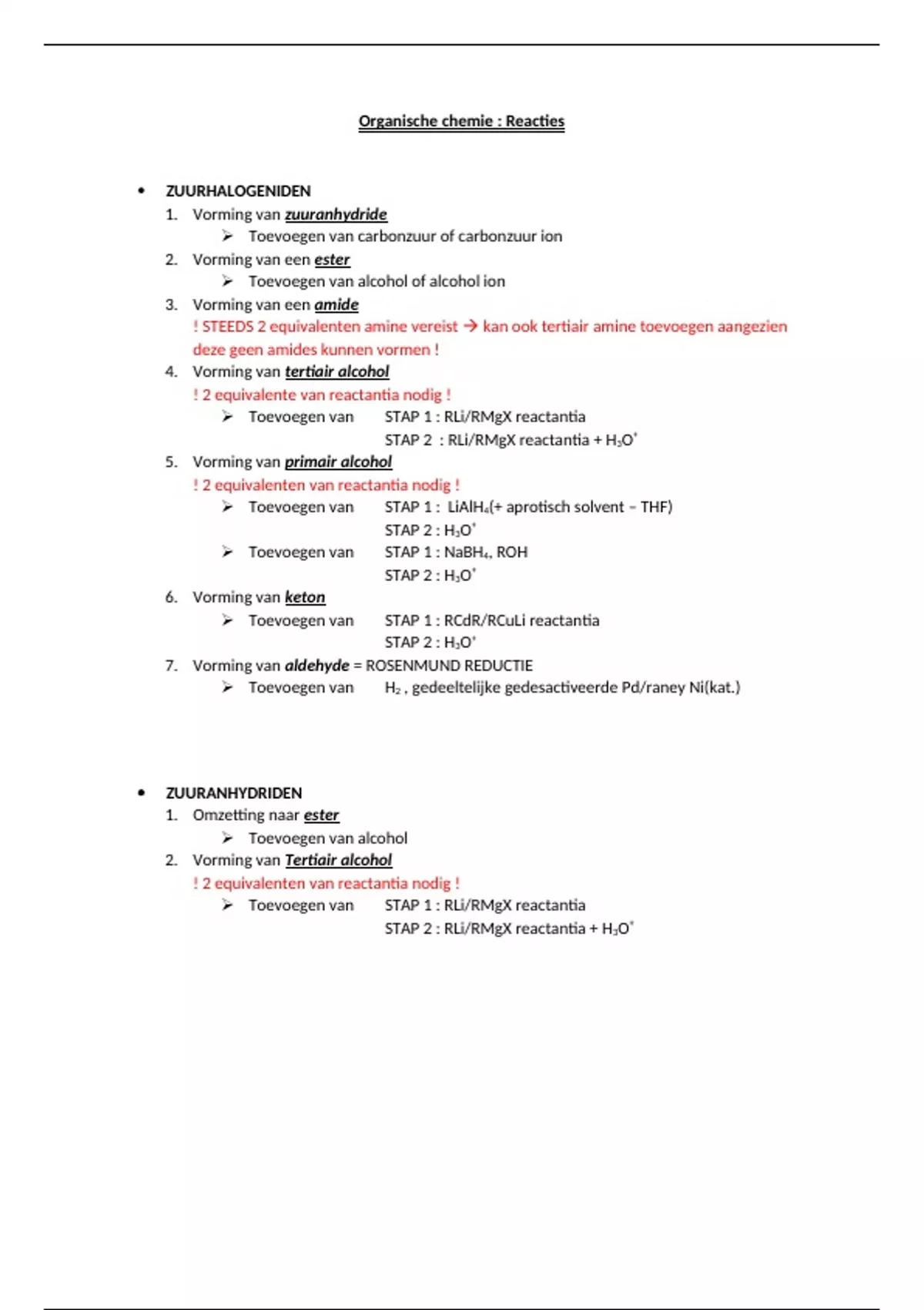 Omvat een samenvatting/overzicht van alle reacties gezien bij Organische Chemie II. Makkelijker voor bij het studeren en het maken van oefeningen over eenstaps- & meerstapsreacties