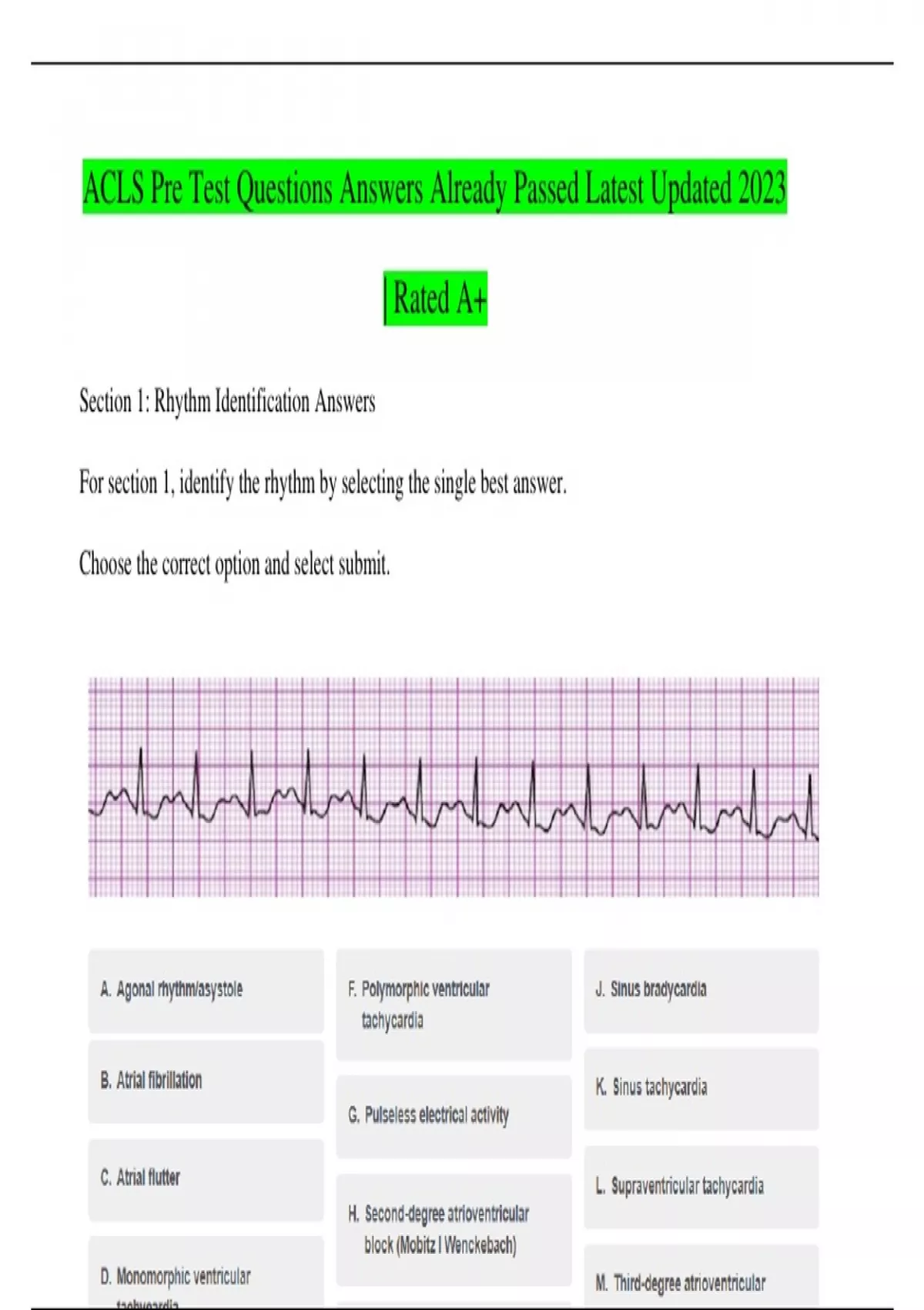 ACLS Pre Test Questions Answers Already Passed Latest Updated 2023 | Rated A+ Section 1: Rhythm Identification Answers For section 1, identify the rhythm by selecting the single best answer. Choose the correct option and select submit. Sinus tachycardia Answer: Sinus tachycardia. Polymorphic ventricular tachyca