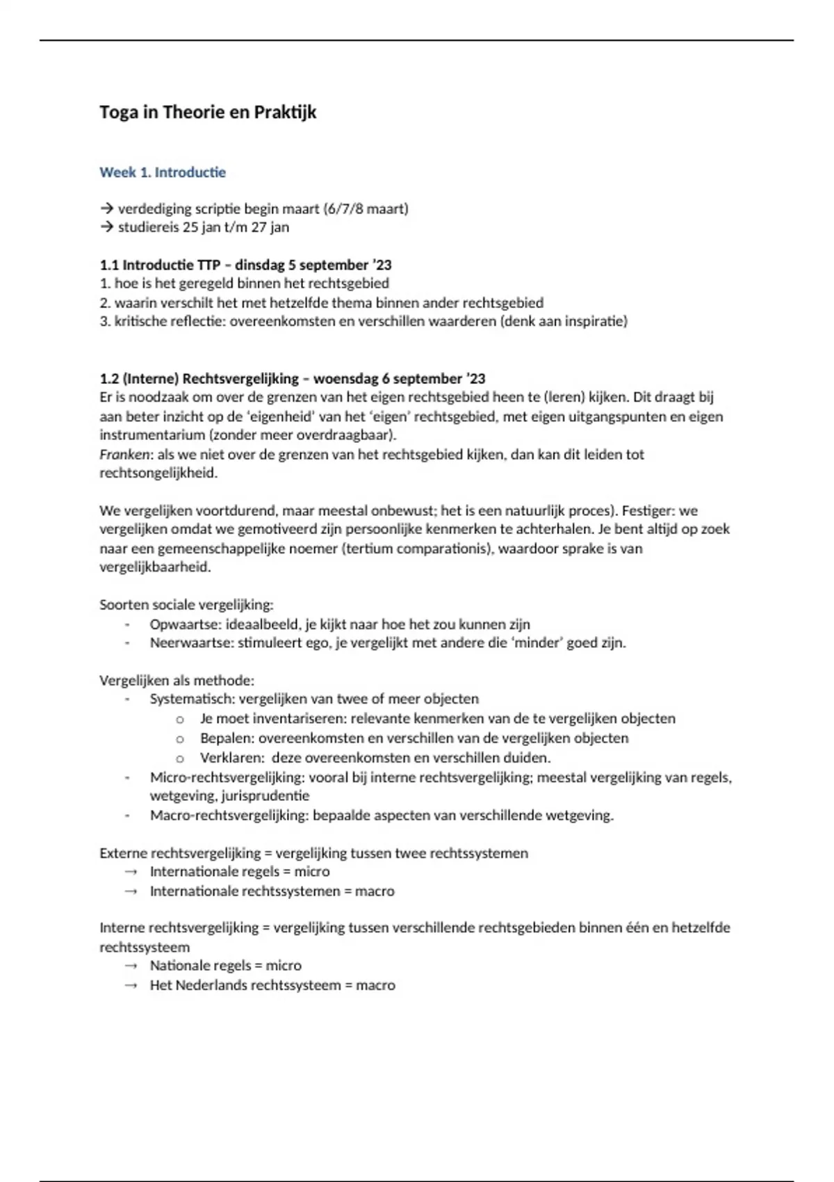 Deze samenvatting bestaat uit aantekeningen van alle colleges die zijn gegeven gedurende het vak Toga in Theorie en Praktijk. Middels kleurtjes is overzichtelijk gemaakt wat bij welk rechtsgebied hoort voor rechtsvergelijking. Daarnaast zijn de stellingen van de verhandelingen per onderwerp (beknopt) uitgewerkt in deze samenvatting, inclusief voor- en tegenargumenten. Met deze samenvatting heb ik een 7.4 gehaald voor het (mondeling) tentamen.