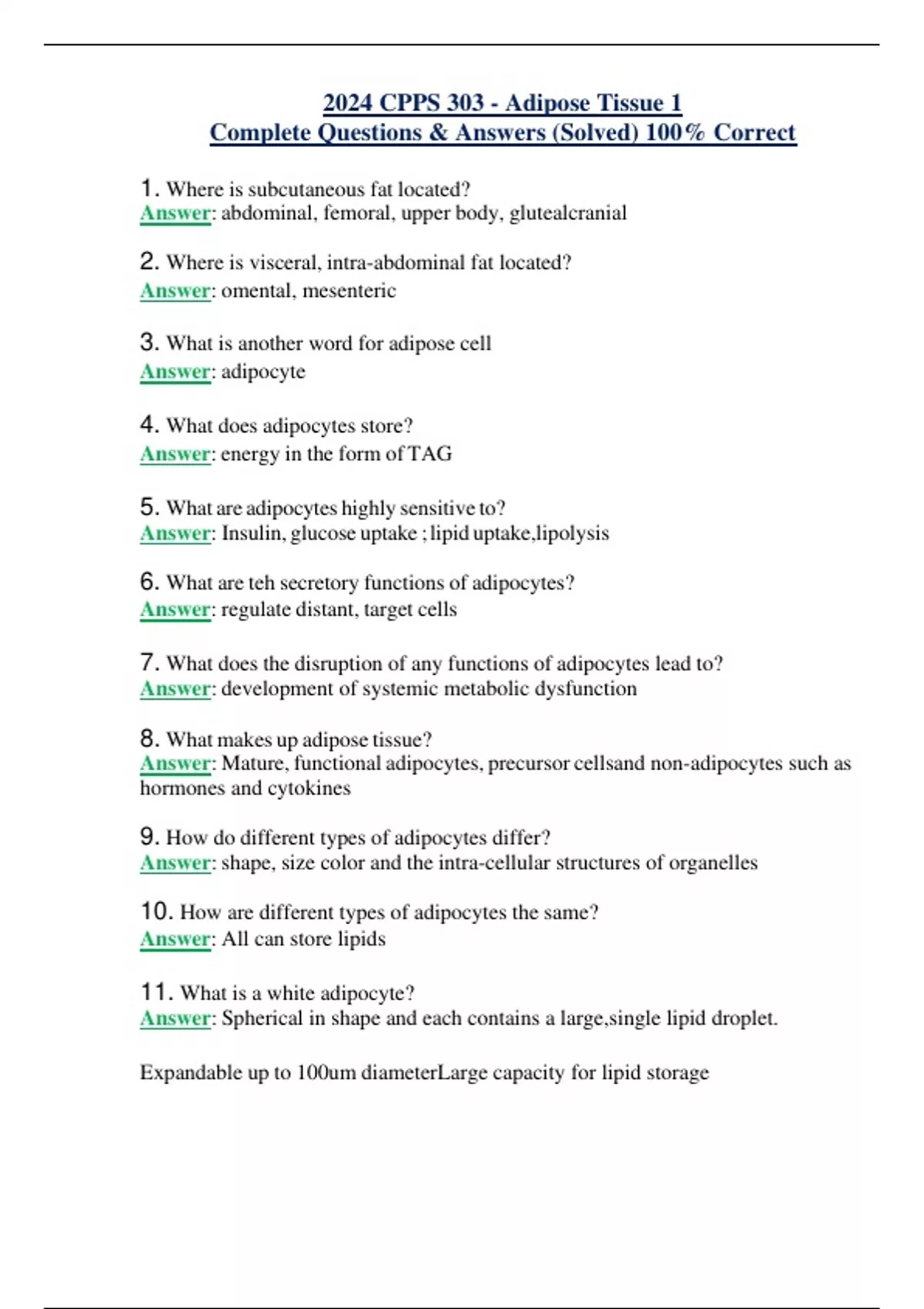 2024 CPPS 303 - Adipose Tissue 1 Complete Questions & Answers (Solved) 100% Correct 1. Where is subcutaneous fat located? Answer: abdominal, femoral, upper body, glutealcranial 2. Where is visceral, intra-abdominal fat located? Answer: omental, mesenteric 3. What is another word for adipose cell Answer: adipocyte 4. What does adipocytes store? Answer: energy in the form of TAG 5. What are adipocytes highly sensitive to? Answer: Insulin, glucose uptake ;lipid uptake,lipolysis 6. What are teh secretory functions of adipocytes? Answer: regulate distant, target cells 7. What does the disruption of any functions of adipocytes lead to? Answer: development of systemic metabolic dysfunction 8. What makes up adipose tissue? Answer: Mature, functional adipocytes, precursor cellsand non-adipocytes such as hormones and cytokines 9. How do different types of adipocytes differ? Answer:shape, size color and the intra-cellular structures of organelles 10. How are different types of adipocytes the same? Answer: All can store lipids 11. What is a white adipocyte? Answer: Spherical in shape and each contains a large,single lipid droplet. Expandable up to 100um diameterLarge capacity for lipid storage