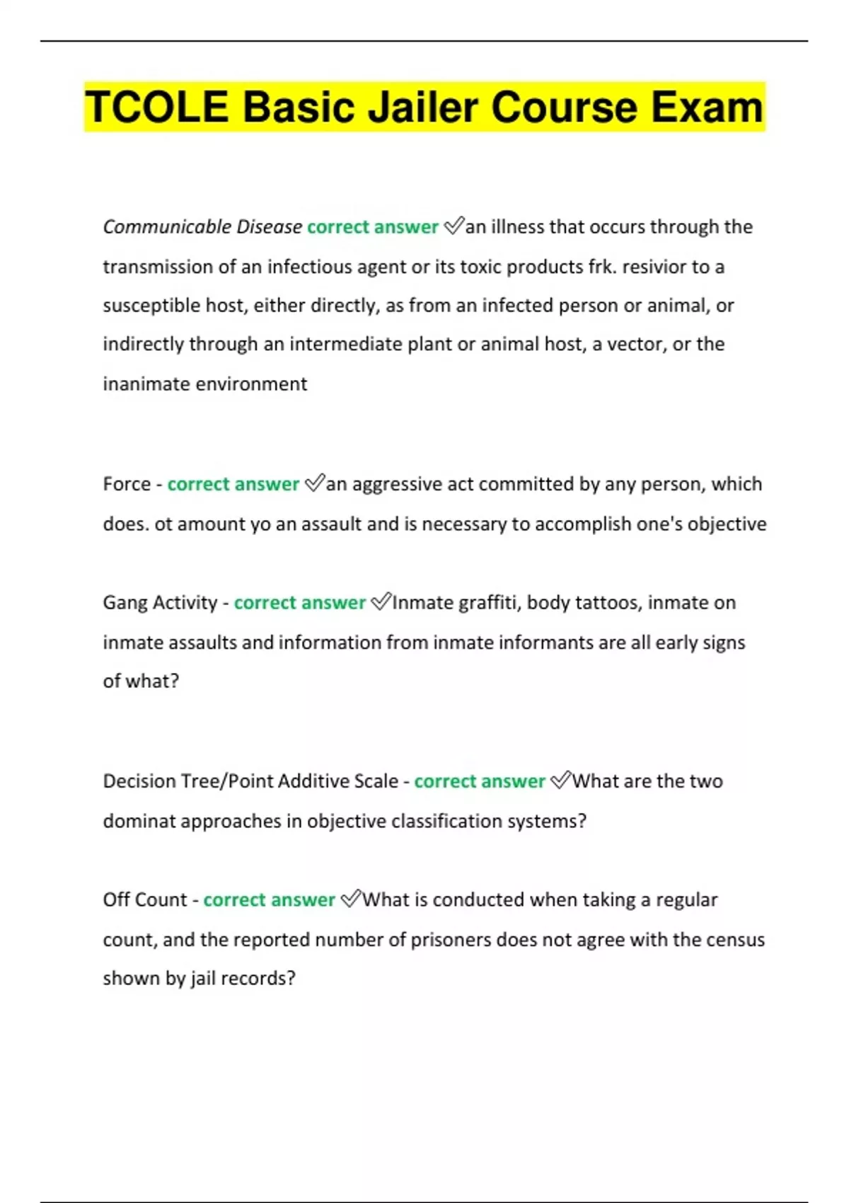 TCOLE Basic Jailer Course Exam Communicable Disease correct answer an illness that occurs through the transmission of an infectious agent or its toxic products frk. resivior to a susceptible host, either directly, as from an infected person or animal, or indirectly through an intermediate plant or animal host, a vector, or the inanimate environment Force - correct answer an aggressive act committed by any person, which does. ot amount yo an assault and is necessary to accomplish one's objective Gang Activity - correct answer Inmate graffiti, body tattoos, inmate on inmate assaults and information from inmate informants are all early signs of what? Decision Tree/Point Additive Scale - correct answer What are the two dominat approaches in objective classification systems? Off Count - correct answer What is conducted when taking a regular count, and the reported number of prisoners does not agree with the census shown by jail records?