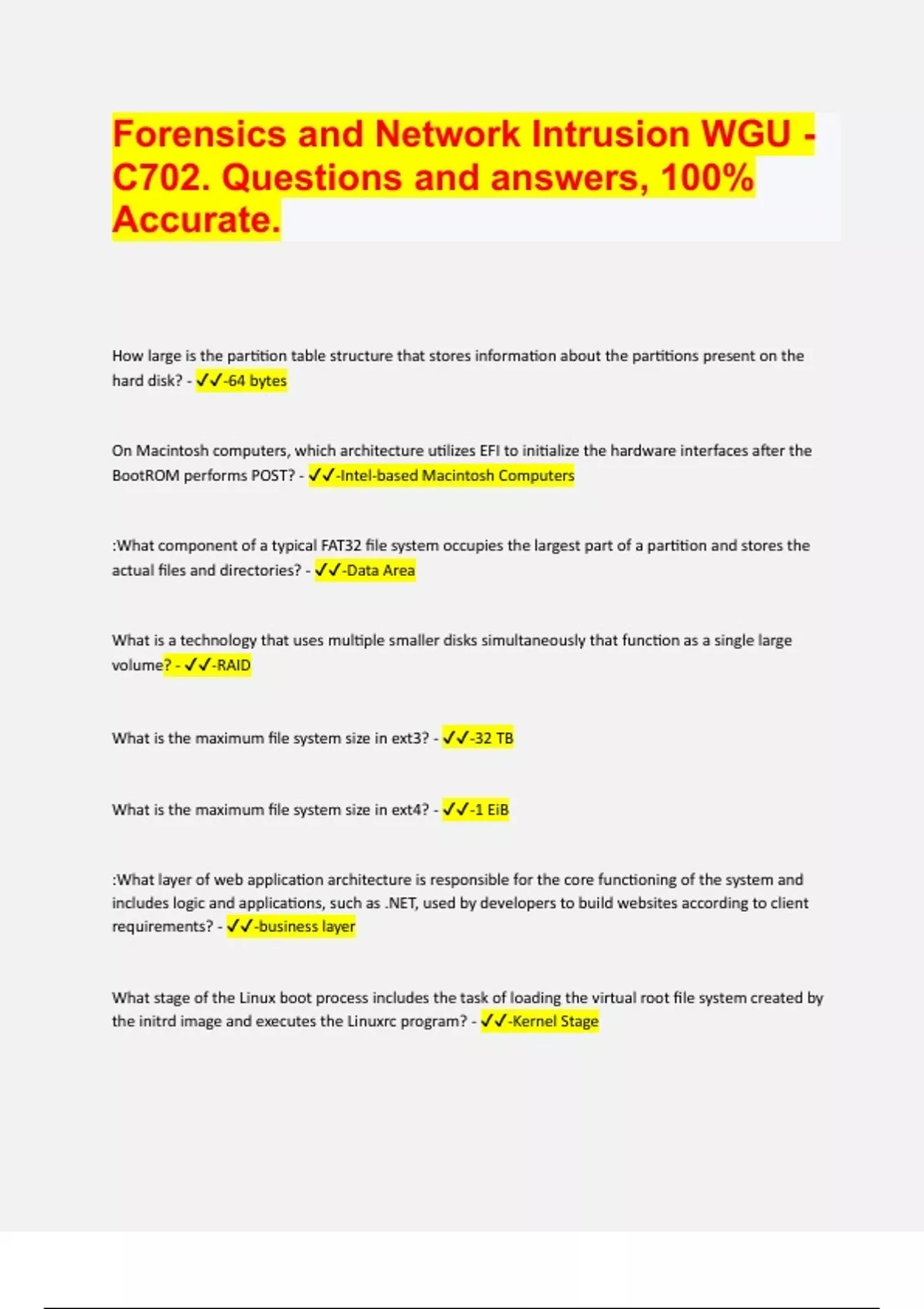 Forensics and Network Intrusion WGU - C702. Questions and answers, 100% Accurate. How large is the partition table structure that stores information about the partitions present on the hard disk? - -64 bytes On Macintosh computers, which architecture utilizes EFI to initialize the hardware interfaces after the BootROM performs POST? - -Intel-based Macintosh Computers :What component of a typical FAT32 file system occupies the largest part of a partition and stores the actual files and directories? - -Data Area What is a technology that uses multiple smaller disks simultaneously that function as a single large volume? - -RAID What is the maximum file system size in ext3? - -32 TB What is the maximum file system size in ext4? - -1 EiB :What layer of web application architecture is responsible for the core functioning of the system and includes logic and applications, such as .NET, used by developers to build websites according to client requirements? - -business layer What stage of the Linux boot process includes the task of loading the virtual root file system created by the initrd image and executes the Linuxrc program? - -Kernel Stage What UFS file system part comprises a collection, including a header with statistics and free lists, a number of inodes containing file attributes, and a number of data blocks? - -cylinder group