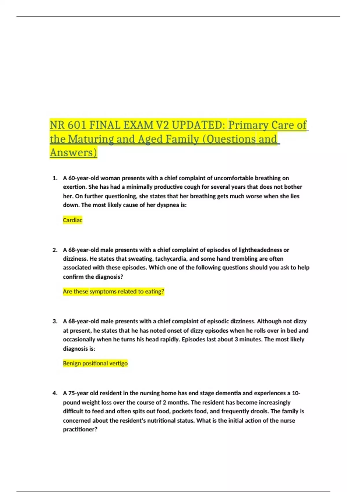 1. A 60-year-old woman presents with a chief complaint of uncomfortable breathing on