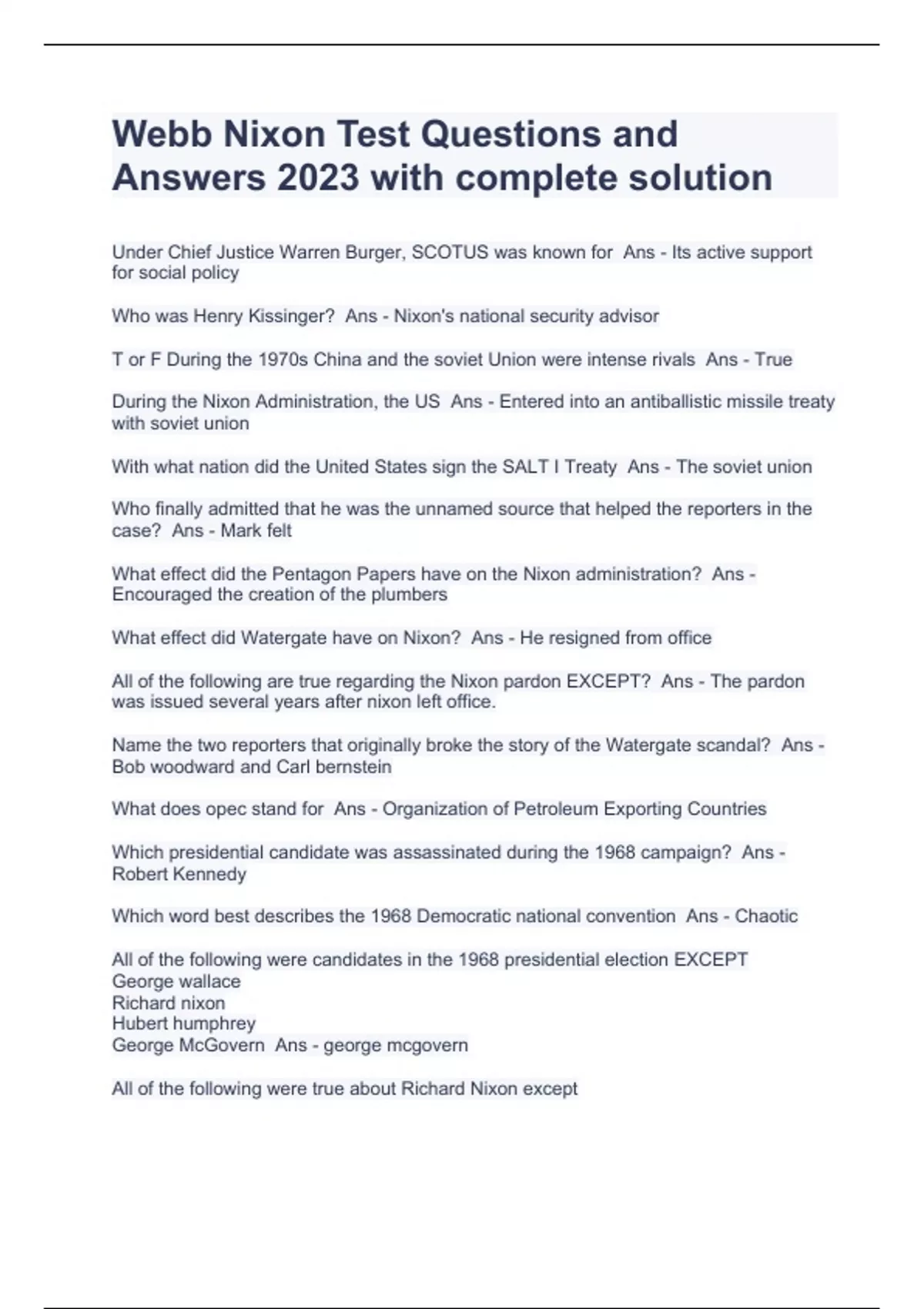 Webb Nixon Test Questions and Answers 2023 with complete solution