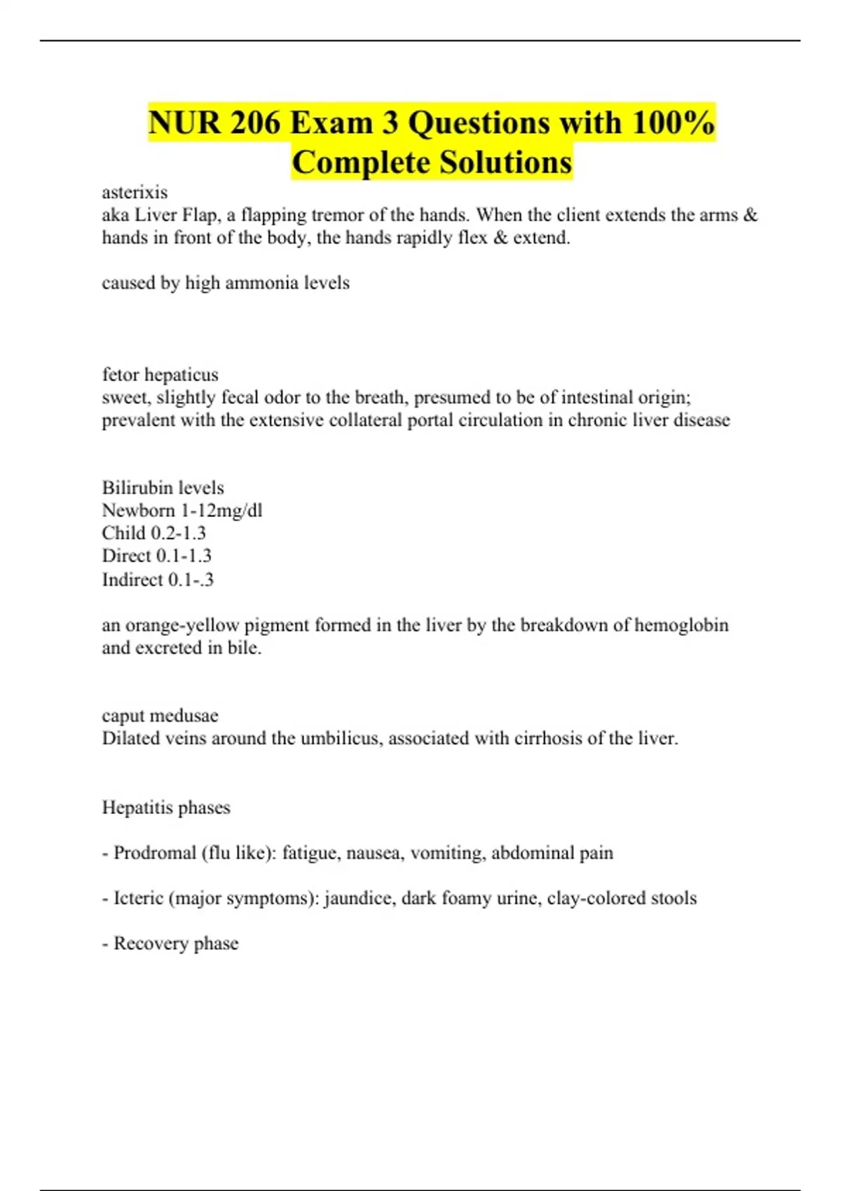 asterixis aka Liver Flap, a flapping tremor of the hands. When the client extends the arms & hands in front of the body, the hands rapidly flex & extend. caused by high ammonia levels fetor hepaticus sweet, slightly fecal odor to the breath, presumed to be of intestinal origin; prevalent with the extensive collateral portal circulation in chronic liver disease Bilirubin levels Newborn 1-12mg/dl Child 0.2-1.3 Direct 0.1-1.3 Indirect 0.1-.3 an orange-yellow pigment formed in the liver by the breakdown of hemoglobin and excreted in bile. caput medusae Dilated veins around the umbilicus, associated with cirrhosis of the liver. Hepatitis phases - Prodromal (flu like): fatigue, nausea, vomiting, abdominal pain - Icteric (major symptoms): jaundice, dark foamy urine, clay-colored stools - Recovery phase cholestasis stoppage of bile flow Liver anatomy 1. Largest solid organ of the body 2. Consists of two major lobes that are separated by the falciform ligament 3. Each lobe is made of two lobules 4. Each lobule is made of small passages called sinusoids 5. Sinusoids empty their contents into a central vein Liver functions Responsible for: The metabolism of fats, proteins, and carbohydrates. Excretion of bilirubin, cholesterol, hormones, and drugs. Enzyme activation. Storage of glycogen, vitamins, and minerals. Synthesis of plasma proteins, such as albumin, and clotting factors. Blood detoxification and purification. Bile production and secretion. Detoxify poisonous substances like bacteria & certain drugs, reseve the ability to divide until it needs to. cirrhosis chronic degenerative disease of the liver Conjugated bilirubin (direct) 0.2 mg/dL Increased: liver disease, obstructive jaundice deamination the removal of an amino group from an organism, particularly from an amino acid enterohepatic recycling the process whereby drug is eliminated from the liver/biliary tract into the GI tract and then reabsorbed from the GI tract back to the liver intrahepatic jaundice Occurs with disease or damage to hepatocytes Hepatitis or cirrhosis prehepatic jaundice Result of excessive destruction of red blood cells Characteristic of hemolytic anemias or transfusion reactions Post-hepatic jaundice Cause: Bile flow obstruction Associated conditions: Strictures of the bile duct, gallstones, tumors of the bile duct Labs: Increased conjugated bilirubin icterus another name for jaundice IK-ter-us (from Greek for jaundice) NALFD Non-alcoholic fatty liver disease nonalcoholic steatohepatitis (NASH) NASH is the most extreme form of NAFLD, and is regarded as a major cause of cirrhosis of the liver. portal hypertension s/s prominent abd wall veins (caput medusa) hemorrhoids, enlarged spleen, anemia, GI bleeding, esophageal varices. Rx: balloon, vasopressin, nitro,