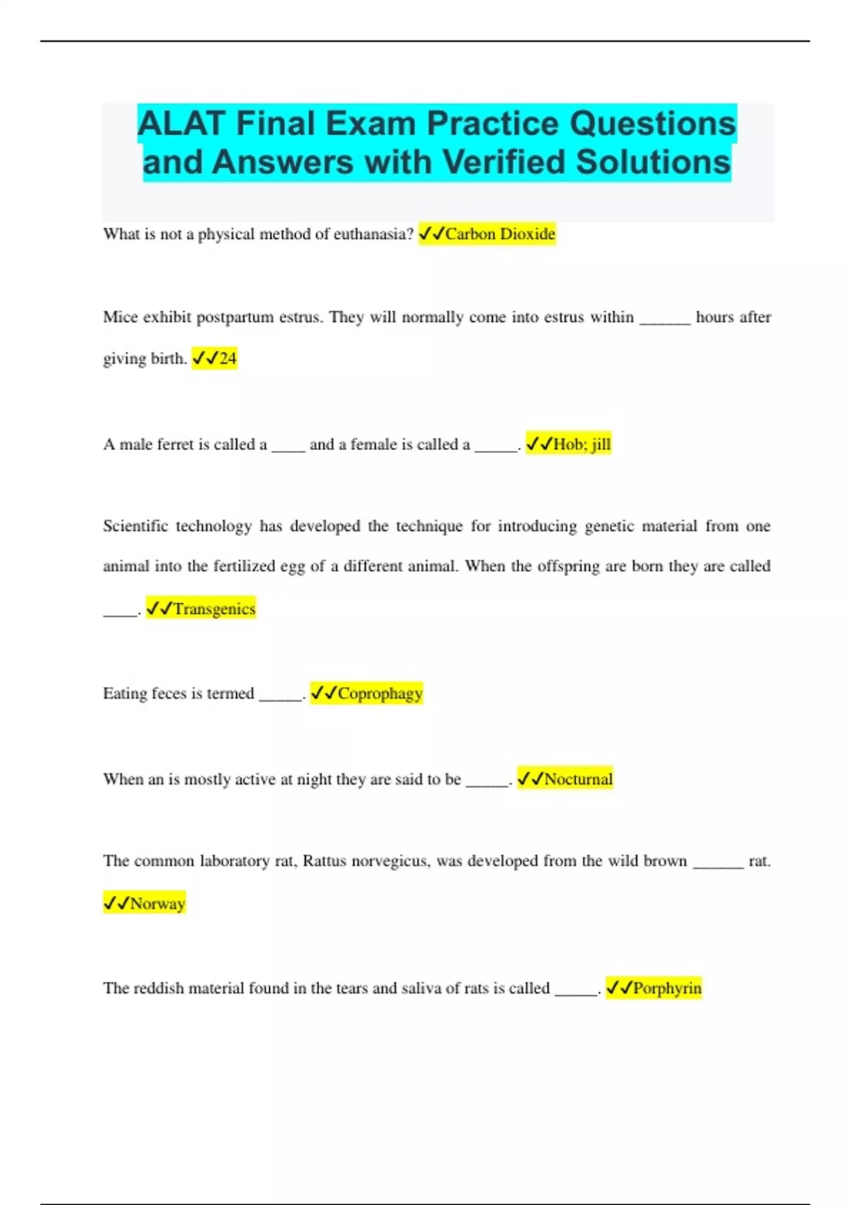 ALAT Final Exam Practice Questions and Answers with Verified Solutions What is not a physical method of euthanasia? Carbon Dioxide Mice exhibit postpartum estrus. They will normally come into estrus within ______ hours after giving birth. 24 A male ferret is called a ____ and a female is called a _____. Hob; jill Scientific technology has developed the technique for introducing genetic material from one animal into the fertilized egg of a different animal. When the offspring are born they are called ____. Transgenics Eating feces is termed _____. Coprophagy When an is mostly active at night they are said to be _____. Nocturnal The common laboratory rat, Rattus norvegicus, was developed from the wild brown ______ rat. Norway The reddish material found in the tears and saliva of rats is called _____. Porphyrin The hooded rat is also known as a _______ rat. Long-Evans
