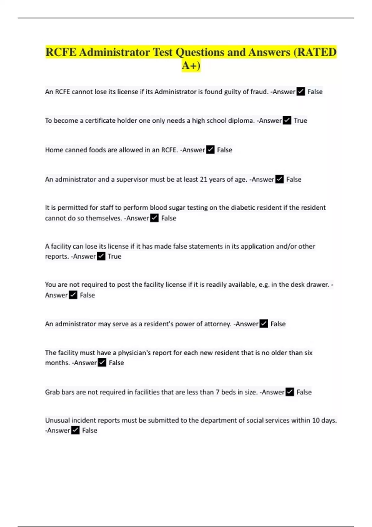 An RCFE cannot lose its license if its Administrator is found guilty of fraud. -Answer False To become a certificate holder one only needs a high school diploma. -Answer True Home canned foods are allowed in an RCFE. -Answer False An administrator and a supervisor must be at least 21 years of age. -Answer False It is permitted for staff to perform blood sugar testing on the diabetic resident if the resident cannot do so themselves. -Answer False A facility can lose its license if it has made false statements in its application and/or other reports. -Answer True You are not required to post the facility license if it is readily available, e.g. in the desk drawer. - Answer False