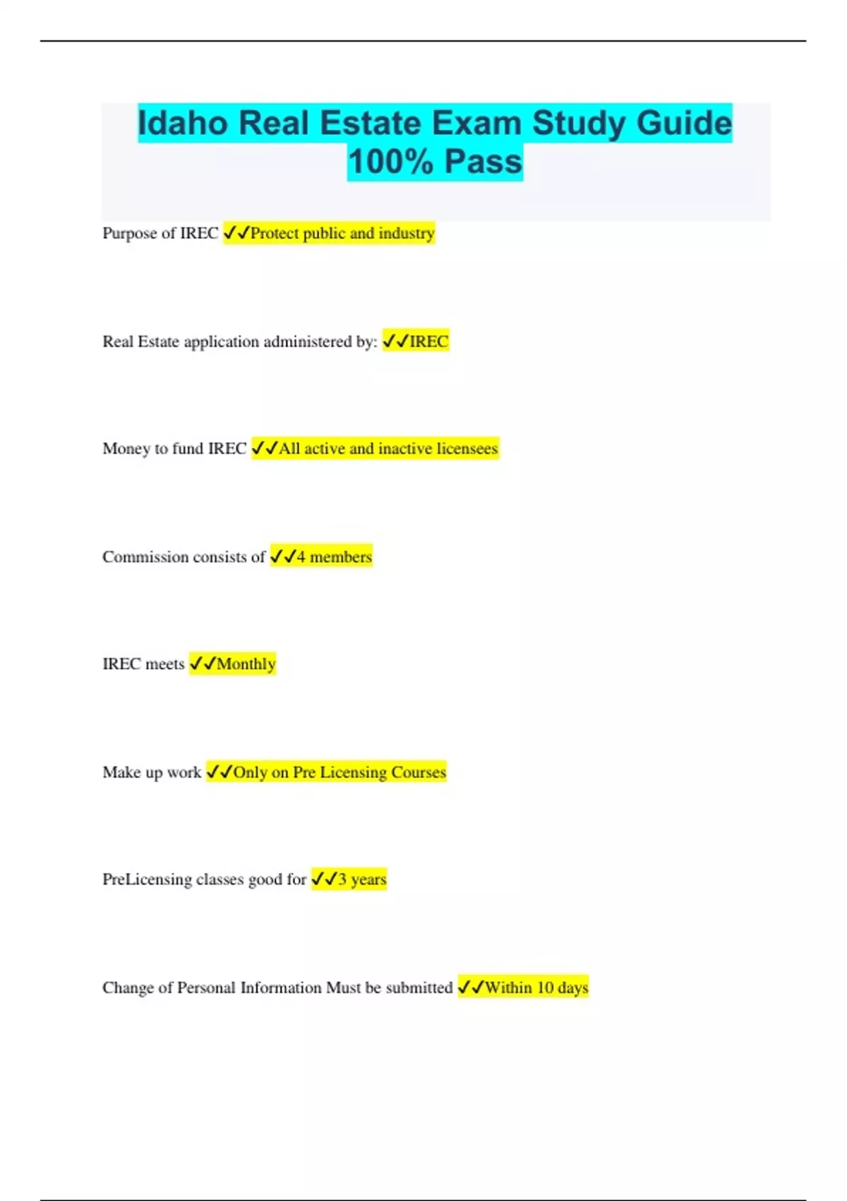 Idaho Real Estate Exam Study Guide 100% Pass Purpose of IREC Protect public and industry Real Estate application administered by: IREC Money to fund IREC All active and inactive licensees Commission consists of 4 members IREC meets Monthly Make up work Only on Pre Licensing Courses PreLicensing classes good for 3 years Change of Personal Information Must be submitted Within 10 days How many Core Classes to Renew License 2 Core Classes E&O policy must have what rating B+ Licensee's renewal must be submitted by : 5pm Mountain Time Pass rate for Broker Exam 75% Who must hold an ID real estate license Anyone acting for another with expecting compensation Exception to holding a real estate license - Idaho Property Management & Lease Minimum age 18 years When to Fingerprints expire 6 months When is E&O Insurance required E&O required on Active License Township Line Bordering Canada T65 North Initial Point in Idaho is where : Boise Meridian Near KUNA How Wide is IDAHO 312 Miles Idaho Subdivision has a Minimum of 5 Lots Lot and Block Describes Recorded Plat