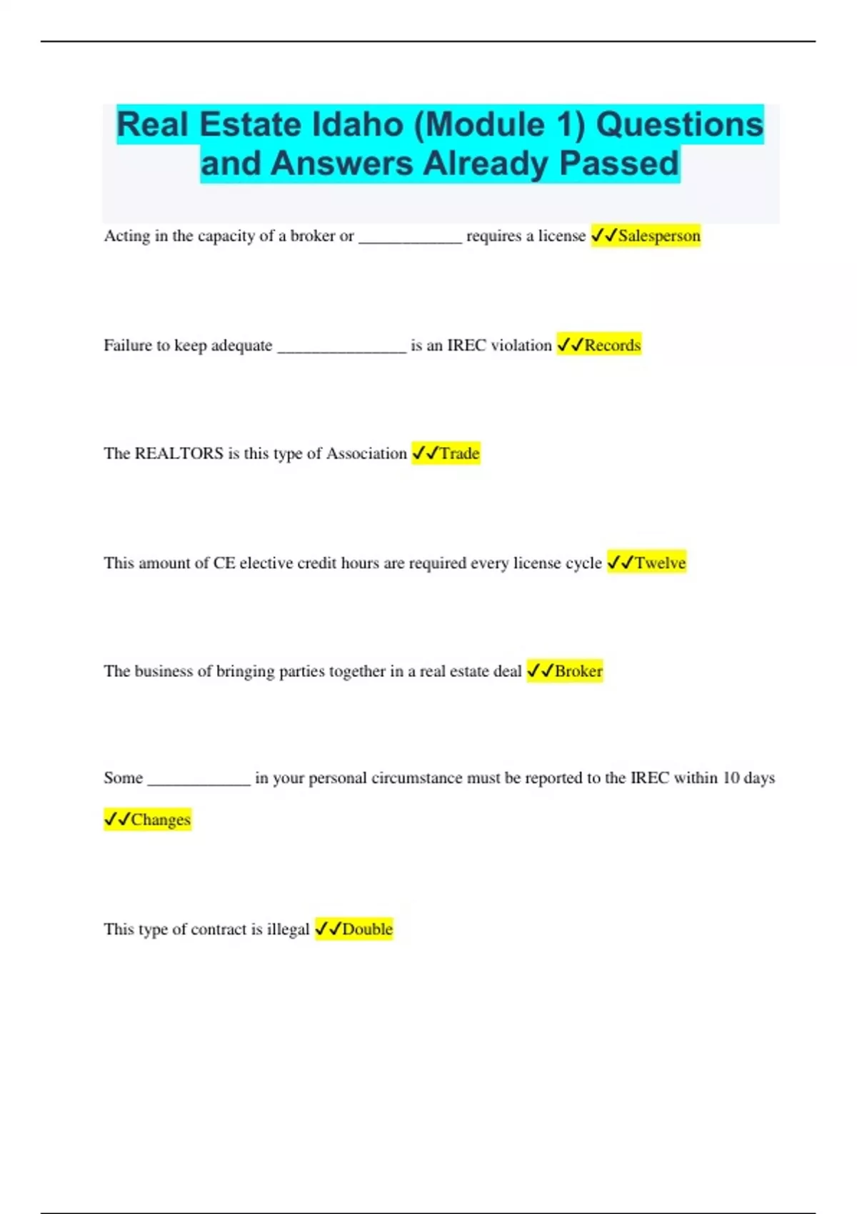 Real Estate Idaho (Module 1) Questions and Answers Already Passed