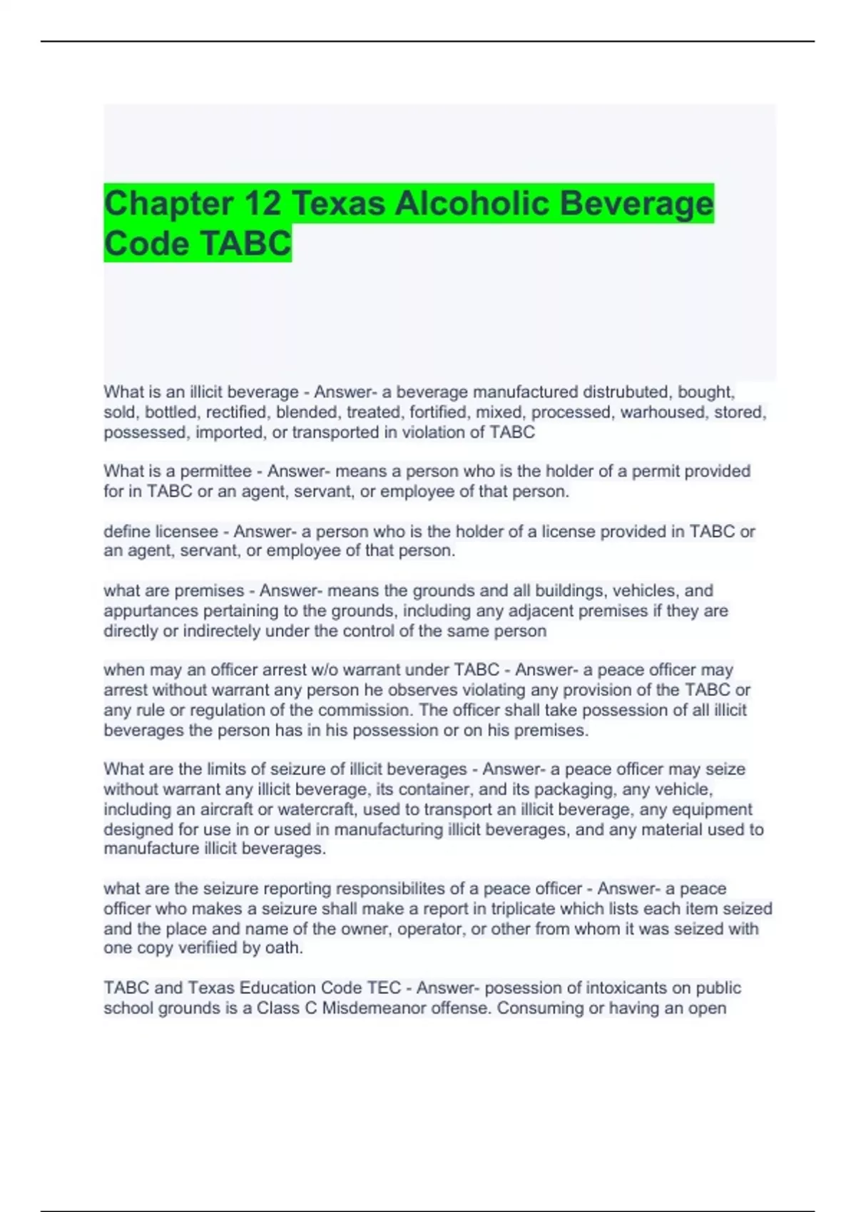 Chapter 12 Texas Alcoholic Beverage Code TABC Exam Questions and Answers