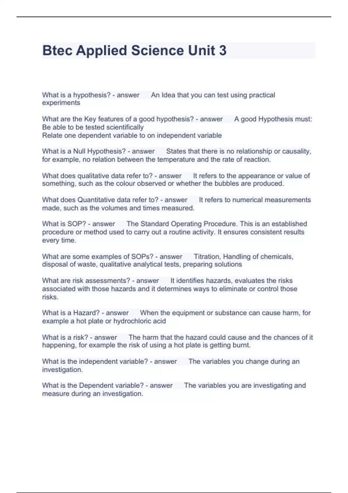 Btec Applied Science Unit 3 Questions and Answers Rated A+