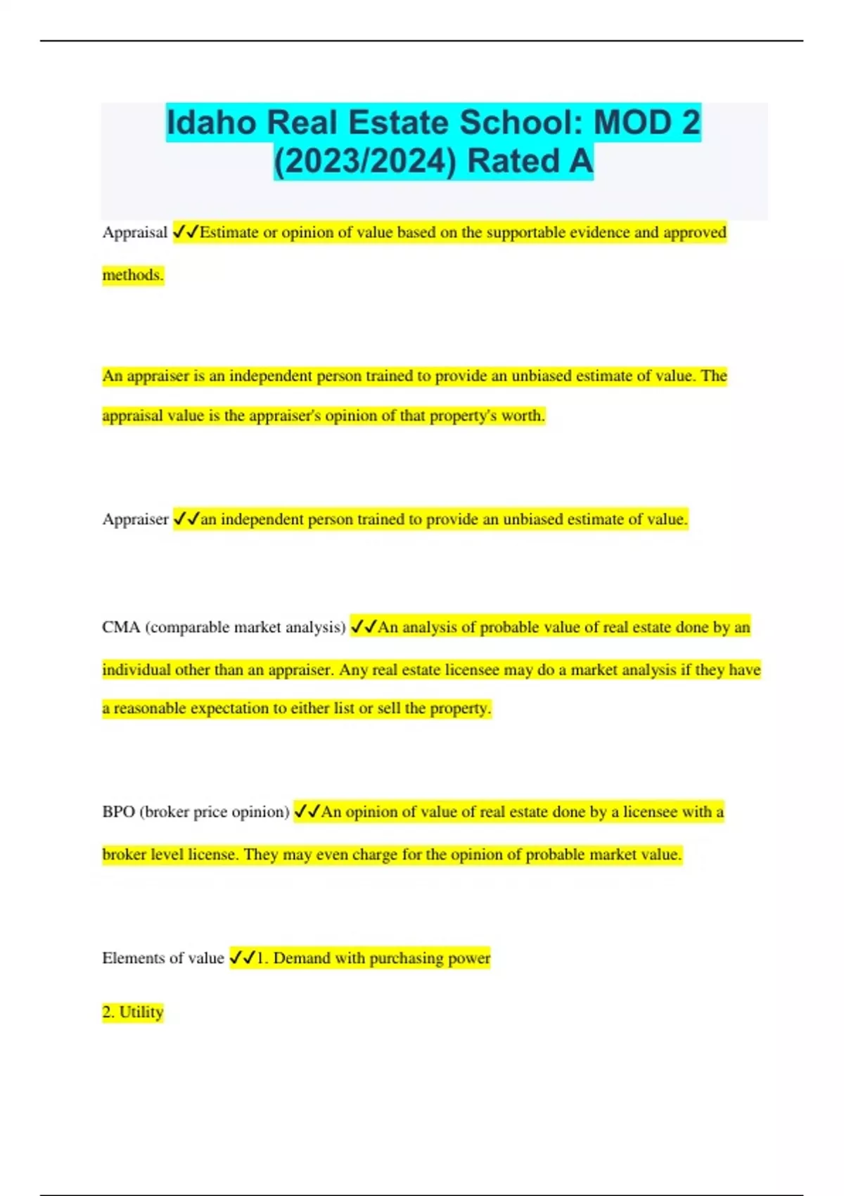Idaho Real Estate School: MOD 2 (2023/2024) Rated A Appraisal Estimate or opinion of value based on the supportable evidence and approved methods. An appraiser is an independent person trained to provide an unbiased estimate of value. The appraisal value is the appraiser's opinion of that property's worth. Appraiser an independent person trained to provide an unbiased estimate of value. CMA (comparable market analysis) An analysis of probable value of real estate done by an individual other than an appraiser. Any real estate licensee may do a market analysis if they have a reasonable expectation to either list or sell the property. BPO (broker price opinion) An opinion of value of real estate done by a licensee with a broker level license. They may even charge for the opinion of probable market value. Elements of value 1. Demand with purchasing power 2. Utility 3. Scarcity D. Transferability Market value An estimate of value based on analysis of data. It may not reflect the cost. The most probable price a property should bring in if payment is made in cash and the buyer and the seller unrelated, well informed, and acting without pressure. Price aka market price The amount for which the property actually sold. Cost The amount of money used to construct improvement + the value of the land. T T or F: Market value and market price should be equal? 1. Demand 2. Utility 3. Scarcity 4. Transferability DUST What are the four elements of value? (DUST) Demand (Element of value) The property must be needed or wanted by someone who has the purchasing power to obtain it. Utility (Element of value) The property must have a useful purpose or satisfy a need. The more useful the property is the more likely someone will pay for it. Scarcity (Element of value) The type of property must have some degree of rareness. This refers to the supply of similar property in relation to the demand for it. Even if it has utility, it will not have value with overabundant. Transferability (Element of value) The ability to transfer title to a property to someone else. Ability to will, lease, give away or sell the property. Anticipation