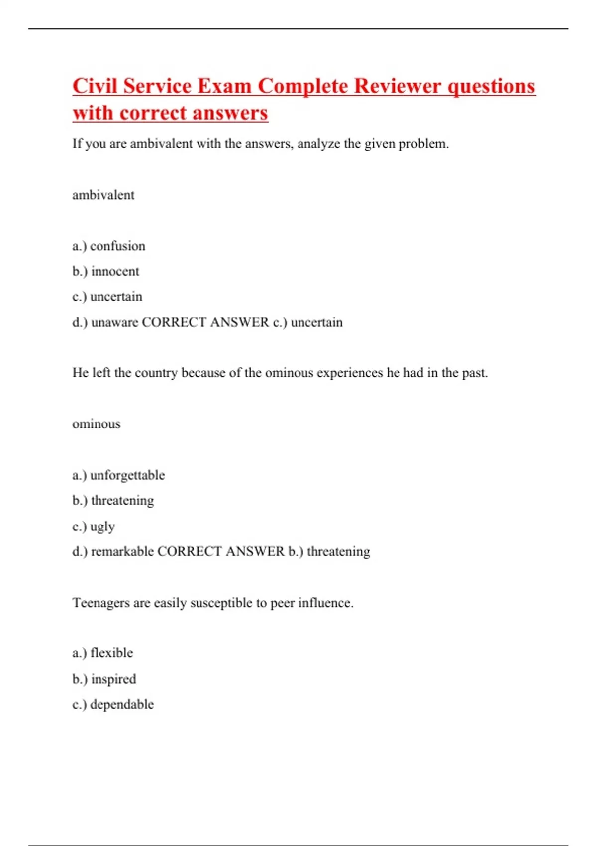 If you are ambivalent with the answers, analyze the given problem. ambivalent a.) confusion b.) innocent c.) uncertain d.) unaware CORRECT ANSWER c.) uncertain He left the country because of the ominous experiences he had in the past. ominous a.) unforgettable b.) threatening c.) ugly d.) remarkable CORRECT ANSWER b.) threatening Teenagers are easily susceptible to peer influence. a.) flexible b.) inspired c.) dependable
