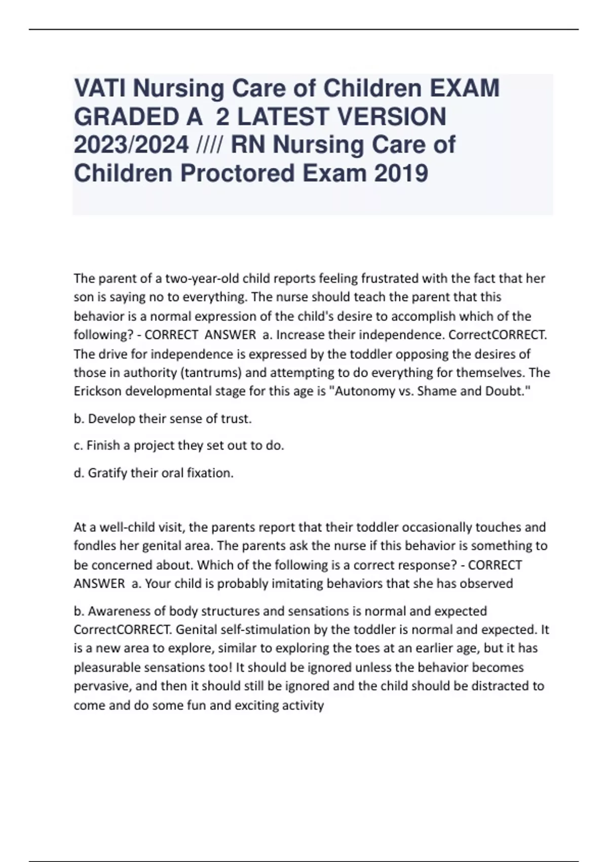 VATI Nursing Care of Children EXAM GRADED A 2 LATEST VERSION 2023/2024 //// RN Nursing Care of Children Proctored Exam 2019 The parent of a two-year-old child reports feeling frustrated with the fact that her son is saying no to everything. The nurse should teach the parent that this behavior is a normal expression of the child's desire to accomplish which of the following? - CORRECT ANSWER a. Increase their independence. CorrectCORRECT. The drive for independence is expressed by the toddler opposing the desires of those in authority (tantrums) and attempting to do everything for themselves. The Erickson developmental stage for this age is "Autonomy vs. Shame and Doubt." b. Develop their sense of trust. c. Finish a project they set out to d