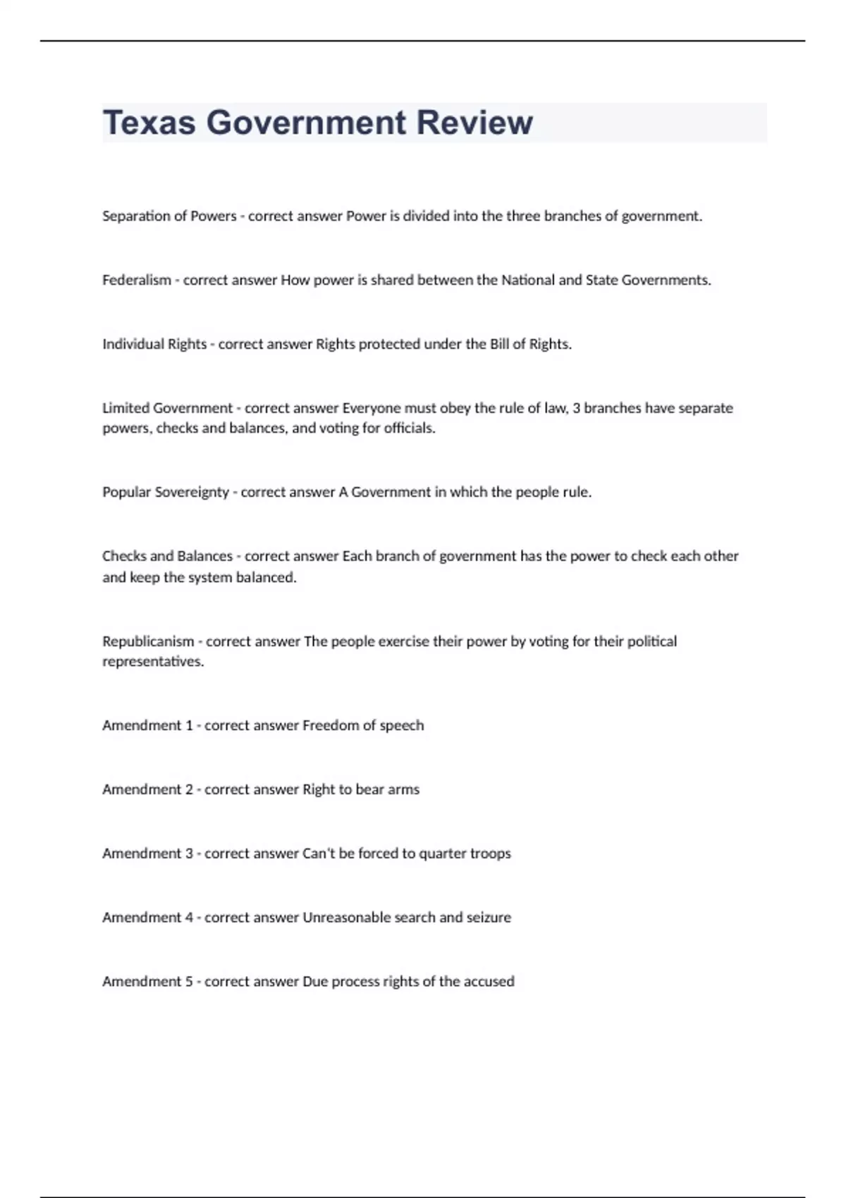 Texas Government ReviewSeparation of Powers - correct answer Power is divided into the three branches of government. Federalism - correct answer How power is shared between the National and State Governments. Individual Rights - correct answer Rights protected under the Bill of Rights. Limited Government - correct answer Everyone must obey the rule of law, 3 branches have separate powers, checks and balances, and voting for officials. Popular Sovereignty - correct answer A Government in which the people rule. Checks and Balances - correct answer Each branch of government has the power to check each other and keep the system balanced. Republicanism - correct answer The people exercise their power by voting for their political representatives. Amendment 1 - correct answer Freedom of speech Amendment 2 - correct answer Right to bear arms Amendment 3 - correct answer Can't be forced to quarter troops Amendment 4 - correct answer Unreasonable search and seizure Amendment 5 - correct answer Due process rights of the accused Amendment 6 - correct answer Right to a speedy and public trial Amendment 7 - correct answer Right to a trial by jury Amendment 8 - correct answer Cruel and unusual punishments Amendment 9 - correct answer Right of the people Amendment 10 - correct answer Powers left to the states What are the 3 branches of government? - correct answer Legislative, Executive, and Judicial Legislative - correct answer Makes the laws Executives - correct answer Carry out the laws Judicial - correct answer Interpret laws, decides legal cases ( can declare a law as unconstitutional) The U.S. And Texas Constitutions reflect similar principles and rights through the following: - correct answer Bill of Rights, Separation of Power, and checks and balances. Both the U.S. And Texas Constitution elect _________ to the legislatures and provides for a system of _______ and ________. - correct answer Representatives; Checks; Balances The _____________________ limits the power of the government by separating the branches and powers and allowing the ____________ to vote for the government officials. - correct answer Texas Constitution; citizens The bill of rights - correct answer Protects individual rights