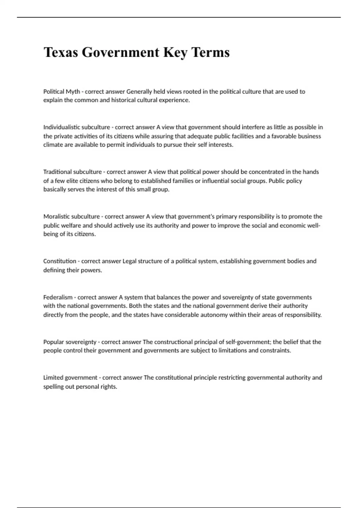 Texas Government Key Terms Political Myth - correct answer Generally held views rooted in the political culture that are used to explain the common and historical cultural experience. Individualistic subculture - correct answer A view that government should interfere as little as possible in the private activities of its citizens while assuring that adequate public facilities and a favorable business climate are available to permit individuals to pursue their self interests. Traditional subculture - correct answer A view that political power should be concentrated in the hands of a few elite citizens who belong to established families or influential social groups. Public policy basically serves the interest of this small group. Moralistic subculture - correct answer A view that government's primary responsibility is to promote the public welfare and should actively use its authority and power to improve the social and economic well-being of its citizens. Constitution - correct answer Legal structure of a political system, establishing government bodies and defining their powers. Federalism - correct answer A system that balances the power and sovereignty of state governments with the national governments. Both the states and the national government derive their authority directly from the people, and the states have considerable autonomy within their areas of responsibility. Popular sovereignty - correct answer The constructional principal of self-government; the belief that the people control their government and governments are subject to limitations and constraints. Limited government - correct answer The constitutional principle restricting governmental authority and spelling out personal rights. Separation of powers - correct answer The division of authourity among three distinct branches of government- the legislative, the executive, and the judicial- which serves as checks and balances on each other's power. Right-to-work law - correct answer Law prohibiting the requirements of union membership in order to get or hold a job. Grange - correct answer An organization formed in the late nineteenth century to improve the lot of farmers. Its influence in Texas after Reconstruction was felt in constitutional provisions limiting taxes and government spending and restricting banks railroads and other big businesses. Devolution - correct answer Return of powers assumed by the Federal government to the states. Supremacy clause - correct answer A provision of the U.S. Constitution that says federal law prevails in conflicts between the powers of the states and the national government. Cooperative federalism - correct answer Policies emphasizing cooperative efforts among the federal, state, and local governments to address common problems and provide public services to the citizens. Mandates - correct answer Federal laws or regulations that require state or local governments to take certain actions, often at costs that the federal government doesn't reimburse. The state government also imposes mandates on local governments. Revenue sharing - correct answer A program begun under President Nixon and later repealed in which state and local governments received federal aid that could be used for virtually any purpose the recipient government wanted. Project grant - correct answer A federal grant for a defined project. Formula grant - correct answer A federal grant based in specific criteria such as income levels or population.