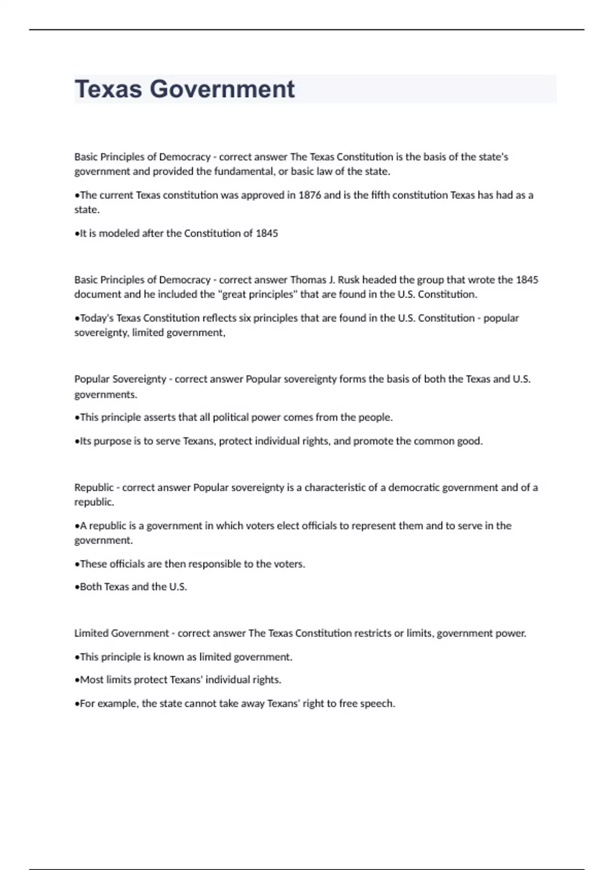 Basic Principles of Democracy - correct answer The Texas Constitution is the basis of the state's government and provided the fundamental, or basic law of the state. •The current Texas constitution was approved in 1876 and is the fifth constitution Texas has had as a state. •It is modeled after the Constitution of 1845 Basic Principles of Democracy - correct answer Thomas J. Rusk headed the group that wrote the 1845 document and he included the "great principles" that are found in the U.S. Constitution. •Today's Texas Constitution reflects six principles that are found in the U.S. Constitution - popular sovereignty, limited government, Popular Sovereignty - correct answer Popular sovereignty forms the basis of both the Texas and U.S. governments. •This principle asserts that all political power comes from the people. •Its purpose is to serve Texans, protect individual rights, and promote the common good. Republic - correct answer Popular sovereignty is a characteristic of a democratic government and of a republic. •A republic is a government in which voters elect officials to represent them and to serve in the government. •These officials are then responsible to the voters. •Both Texas and the U.S. Limited Government - correct answer The Texas Constitution restricts or limits, government power. •This principle is known as limited government. •Most limits protect Texans' individual rights. •For example, the state cannot take away Texans' right to free speech. Separation of Powers - correct answer The other principles reflected in the Texas Constitution . •The separation of powers divides power among different government branches. •This principle helps prevent any one branch from becoming too powerful. •Article II of the Texas Constitution divides state government into three Branches of Government - correct answer The legislative branch makes the laws. •The executive branch carries or enforces the laws. •The judicial branch, or court system, decides legal cases and interprets the laws. Checks and Balances - correct answer To further balance power, the Texas Constitution includes a system of checks and balances. •Under this system, each branch has ways to check, or restrain, the other two. •These checks help prevent one branch from controlling the government. The Texas Bill of Rights - correct answer The protection of individual rights is another basic principle of a republic. •To protect Texans' rights, Article I of the state constitution provides a bill of rights. •A bill of rights outlines the civil liberties, or individual rights, that a government promises to protect. The Texas Bill of Rights - correct answer The state's bill of rights includes several rights and freedoms. •The rights of freedom of speech and of the press protect Texans' right to express their ideas and opinions. •The freedom of worship protects Texans' right to practice whatever religion they choose. The Texas Bill of Rights - correct answer Some rights protect the victims of crimes, while others protect the rights or people accused of crimes. •For example, The Texas Bill of rights ensures Texans' rights to a trial by jury. •The bill of rights concludes by declaring that the state can never take away these basic