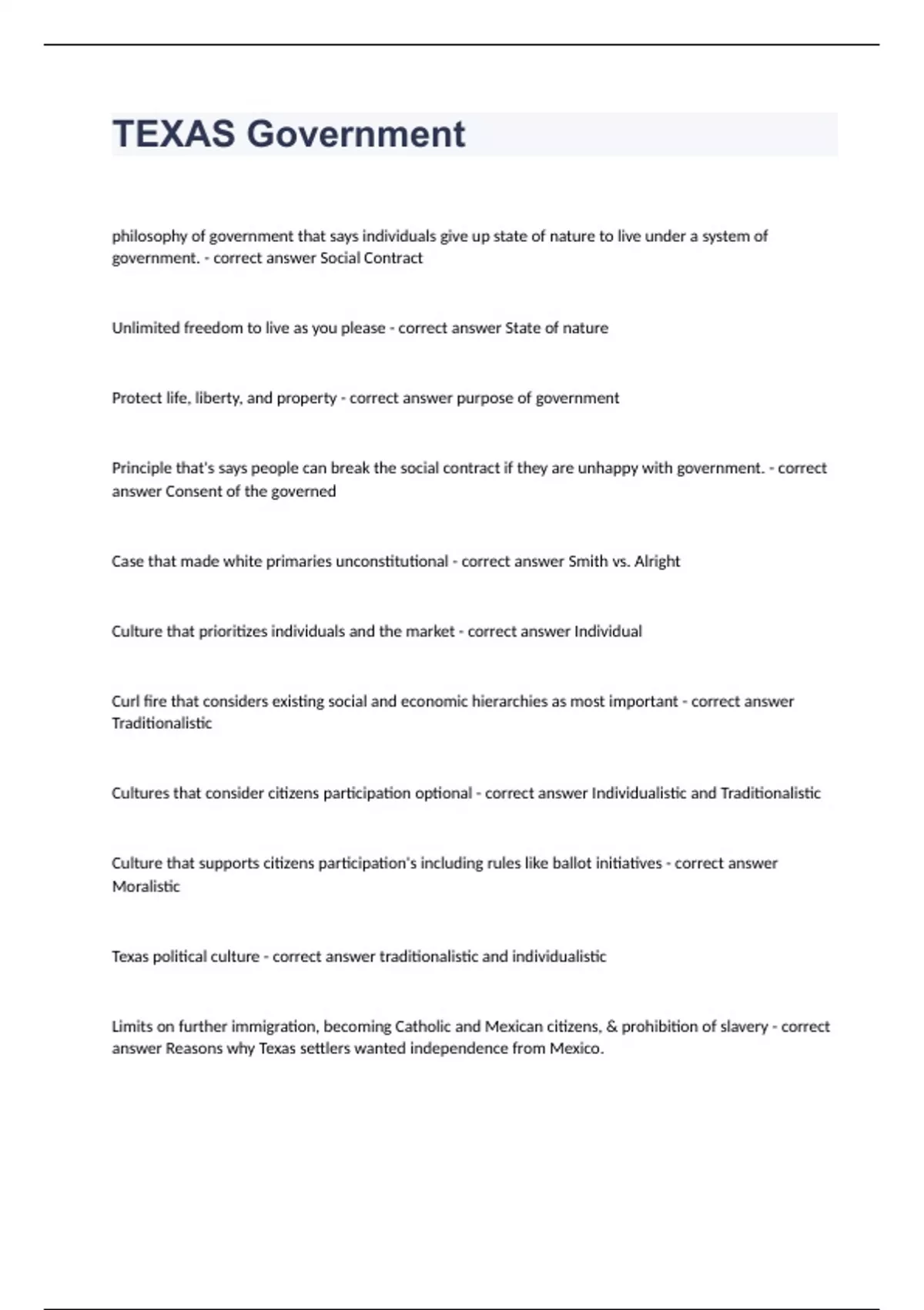 TEXAS Government (questions with 100% correct answers)2023/2024
