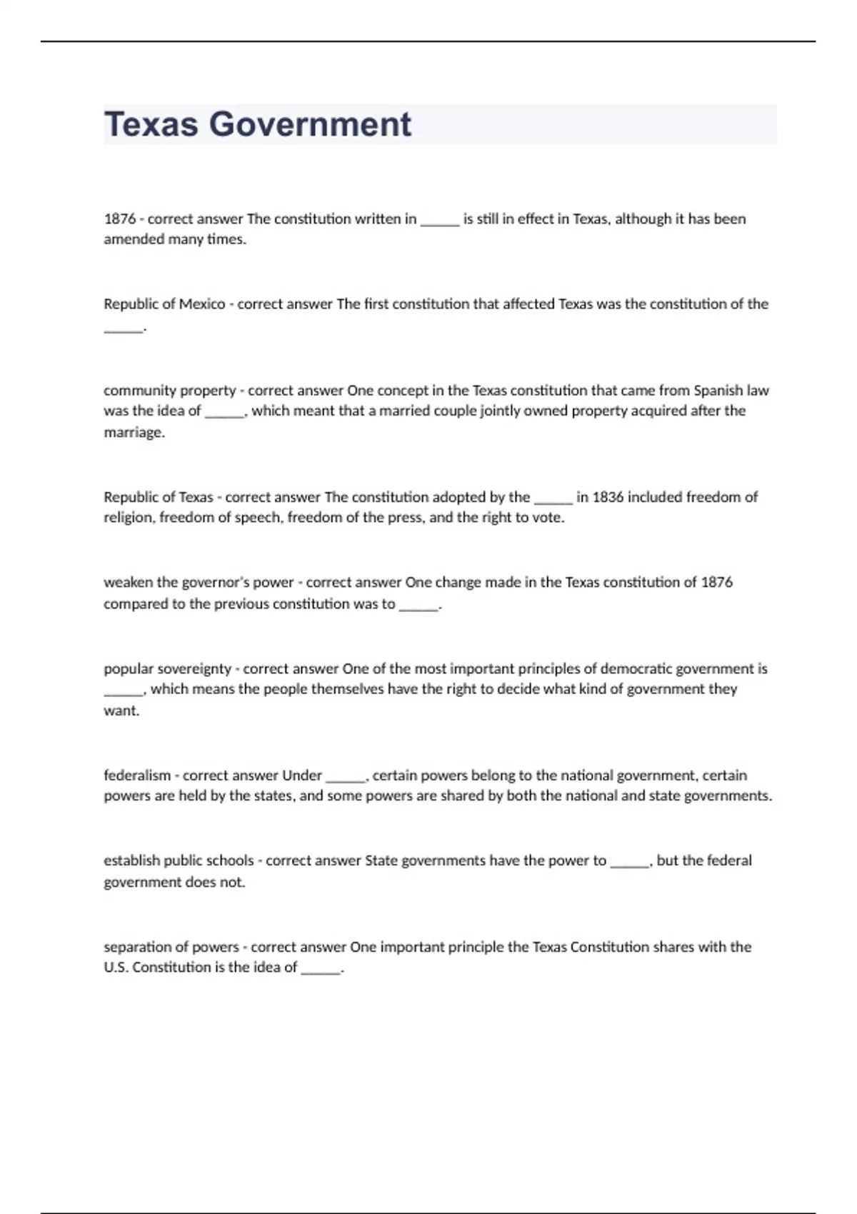 Texas Government1876 - correct answer The constitution written in _____ is still in effect in Texas, although it has been amended many times. Republic of Mexico - correct answer The first constitution that affected Texas was the constitution of the _____. community property - correct answer One concept in the Texas constitution that came from Spanish law was the idea of _____, which meant that a married couple jointly owned property acquired after the marriage. Republic of Texas - correct answer The constitution adopted by the _____ in 1836 included freedom of religion, freedom of speech, freedom of the press, and the right to vote. weaken the governor's power - correct answer One change made in the Texas constitution of 1876 compared to the previous constitution was to _____. popular sovereignty - correct answer One of the most important principles of democratic government is _____, which means the people themselves have the right to decide what kind of government they want. federalism - correct answer Under _____, certain powers belong to the national government, certain powers are held by the states, and some powers are shared by both the national and state governments. establish public schools - correct answer State governments have the power to _____, but the federal government does not. separation of powers - correct answer One important principle the Texas Constitution shares with the U.S. Constitution is the idea of _____. a majority of Texas voters - correct answer To amend the Texas Constitution, two-thirds of both houses of the legislature must vote in favor of the proposed amendment, and then the amendment must by approved by _____. bicameral - correct answer regular - correct answer A(n) _____ session of the Texas legislature takes place only in odd-numbered years and lasts only 140 days. line-item - correct answer The governor can exercise a(n) _____ veto on spending bills, striking out specific items without rejecting the whole appropriations bill. oil and gas industries - correct answer In addition to overseeing and regulating railroads, trucks, and buses operating in Texas, the Texas Railroad Commission also regulates the state's _____. civil - correct answer The Texas justice system covers two types of law: criminal law and _____ law. Supreme Court of Texas - correct answer The two highest courts in the state of Texas are the Court of Criminal Appeals and the _____. sales - correct answer The largest source of state-controlled revenue in Texas is the _____ tax. comptroller of public accounts - correct answer lieutenant governor - correct answer Because the Texas _____ is also the president of the Texas Senate, he or she has considerable influence over state policy. secretary of state - correct answer The _____ is appointed by the governor, and confirmed by the Texas Senate, instead of being elected by voters. Municipal - correct answer _____ government refers to the governments of cities or towns.