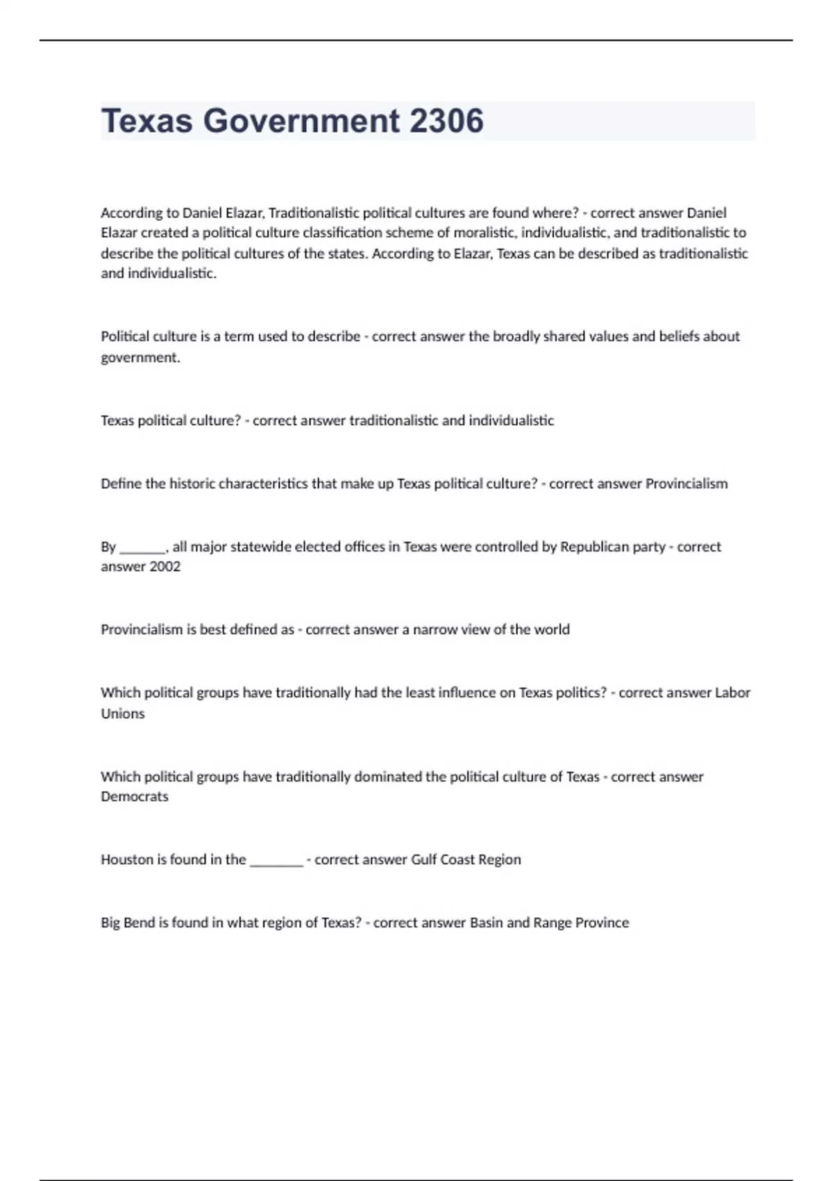 Texas Government 2306According to Daniel Elazar, Traditionalistic political cultures are found where? - correct answer Daniel Elazar created a political culture classification scheme of moralistic, individualistic, and traditionalistic to describe the political cultures of the states. According to Elazar, Texas can be described as traditionalistic and individualistic. Political culture is a term used to describe - correct answer the broadly shared values and beliefs about government. Texas political culture? - correct answer traditionalistic and individualistic Define the historic characteristics that make up Texas political culture? - correct answer Provincialism By ______, all major statewide elected offices in Texas were controlled by Republican party - correct answer 2002 Provincialism is best defined as - correct answer a narrow view of the world Which political groups have traditionally had the least influence on Texas politics? - correct answer Labor Unions Which political groups have traditionally dominated the political culture of Texas - correct answer Democrats Houston is found in the _______ - correct answer Gulf Coast Region Big Bend is found in what region of Texas? - correct answer Basin and Range Province _____ is the system, common in the late nineteenth and early twentieth centuries, by which farmers would be lent land and equipment in exchange for part of the profits - correct answer Sharecropping. Who led the Grange and Populist movements of the late nineteenth century? - correct answer tenant farmers When in Texas history did cattle become big business? - correct answer after the civil war Event that occurred at Spindletop, Texas? - correct answer Oil was discovered NAFTA established - correct answer free trade between Mexico, the United States, and Canada. Approximately what percentage of the current population of Texas is Hispanic? - correct answer 35% which racial or ethnic group in Texas is concentrated in East Texas - correct answer African Americans Which city in Texas currently has the largest population? - correct answer Houston Dallas developed in the late nineteenth century as a result of - correct answer railroads Historically, the economy of Fort Worth has been associated with what industry - correct answer cattle Congress gained the power to tax income through - correct answer 16th amendment State legislatures lost the power to appoint their U.S. senators under - correct answer 17 amendment Both federal and state governments obtain sovereignty directly from - correct answer the consent of the people