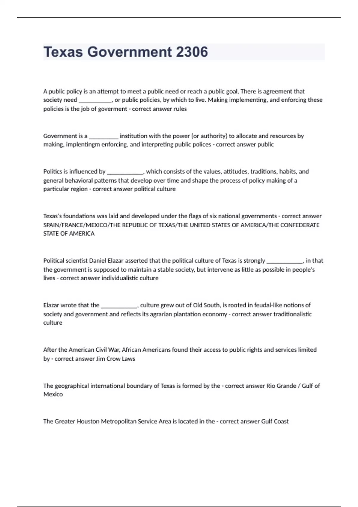 Texas Government 2306 A public policy is an attempt to meet a public need or reach a public goal. There is agreement that society need __________, or public policies, by which to live. Making implementing, and enforcing these policies is the job of goverment - correct answer rules Government is a _________ institution with the power (or authority) to allocate and resources by making, implentingm enforcing, and interpreting public polices - correct answer public Politics is influenced by ___________, which consists of the values, attitudes, traditions, habits, and general behavioral patterns that develop over time and shape the process of policy making of a particular region - correct answer political culture Texas's foundations was laid and developed under the flags of six national governments - correct answer SPAIN/FRANCE/MEXICO/THE REPUBLIC OF TEXAS/THE UNITED STATES OF AMERICA/THE CONFEDERATE STATE OF AMERICA Political scientist Daniel Elazar asserted that the political culture of Texas is strongly ___________, in that the government is supposed to maintain a stable society, but intervene as little as possible in people's lives - correct answer individualistic culture Elazar wrote that the ___________, culture grew out of Old South, is rooted in feudal-like notions of society and government and reflects its agrarian plantation economy - correct answer traditionalistic culture After the American Civil War, African Americans found their access to public rights and services limited by - correct answer Jim Crow Laws The geographical international boundary of Texas is formed by the - correct answer Rio Grande / Gulf of Mexico The Greater Houston Metropolitan Service Area is located in the - correct answer Gulf Coast Historically, the engines of Texas's economy have been driven by the following land-based industries - correct answer cattle, energy, cotton, timber Texas was 80% _______ at the beginning of the 20th Century, but today is more than 85% ____ - correct answer rural / urban A 1933 POTUS- negotiated agreement, called _____________, was approved by Congress to stimulate and expand trade between the US, Mexico, and Canada, by reducing/eliminating barriers to trade over a 15-year period - correct answer NAFTA In 1919, the Texas Legislature gave the ______________ limited regulatory jurisdiction over the state's oil and gas producers. - correct answer Railroad Commission According to the textbook, the oil and gas industry accounts for less than 5% of the state's job. Therefor, Texas is currently placing increased emphasis on alternative energy. - correct answer True Migration of people from rural to cities - correct answer urbanization When large numbers of people are concentrated in urban centers, which become linked in a single, geographic entity - correct answer metropoltanization The growth of relatively small towns and cities, usually incorporated themselves, that are located outside outside the corporate limits of a central city - correct answer sub-urbanization In general, an ______________, area is a core area containing a large population nucleus together with adjacent communities. They are economically and socially integrated with that core. - correct answer metropolitan Cities are eager to obtain the highest possible statistical (population) designation in order to receive access to Congressional approations - correct answer true