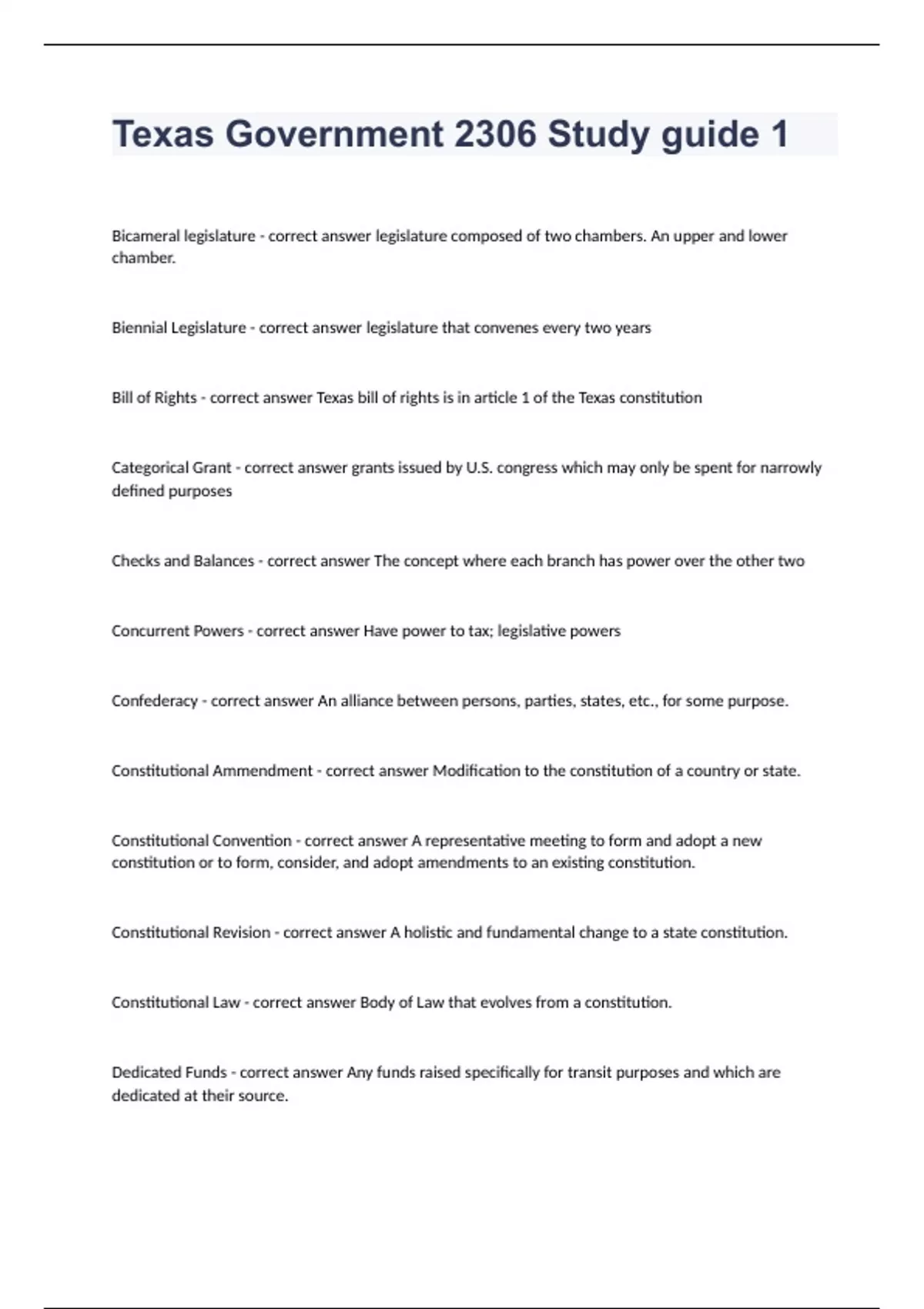 Texas Government 2306 Study guide Bicameral legislature - correct answer legislature composed of two chambers. An upper and lower chamber. Biennial Legislature - correct answer legislature that convenes every two years Bill of Rights - correct answer Texas bill of rights is in article 1 of the Texas constitution Categorical Grant - correct answer grants issued by U.S. congress which may only be spent for narrowly defined purposes Checks and Balances - correct answer The concept where each branch has power over the other two Concurrent Powers - correct answer Have power to tax; legislative powers Confederacy - correct answer An alliance between persons, parties, states, etc., for some purpose. Constitutional Ammendment - correct answer Modification to the constitution of a country or state. Constitutional Convention - correct answer A representative meeting to form and adopt a new constitution or to form, consider, and adopt amendments to an existing constitution. Constitutional Revision - correct answer A holistic and fundamental change to a state constitution. Constitutional Law - correct answer Body of Law that evolves from a constitution. Dedicated Funds - correct answer Any funds raised specifically for transit purposes and which are dedicated at their source. Due process of Law - correct answer A fundamental, constitutional garuntee that all legal proceedings will be fair and that one will be given notice of the proceedings and an opportunity to be heard before the government. Economic Triad - correct answer Houston, San Antonio, Dallas/ 60% of the population Federalism - correct answer system of Government in which power is divided between by constitution between central and regional governments. Eminent Domain - correct answer The right of the government to take your property for the public good with just compensation. General Law Cities - correct answer A municipality that is limited to governmental structures and powers specifically granted by state Law. Grange - correct answer Radical Foreign movement in the late 19th century when farmers wanted better living conditions. Great Depression - correct answer Period from October 1929 when stock market crashed. Great Recession - correct answer an economic downturn caused by rising unemployment, economic stagnation, up to 18 months. 93 million adults out of the work force. Gross State Product (GSP) - correct answer Measurement of a states output; it is the sum of value added from all the industries in the state. Home Rule - correct answer The Government of a colony, dependent country, or region by its own citizens. Initiative Process - correct answer Citizens draft a legislative bill or constitutional amendment, which they then propose by petition.