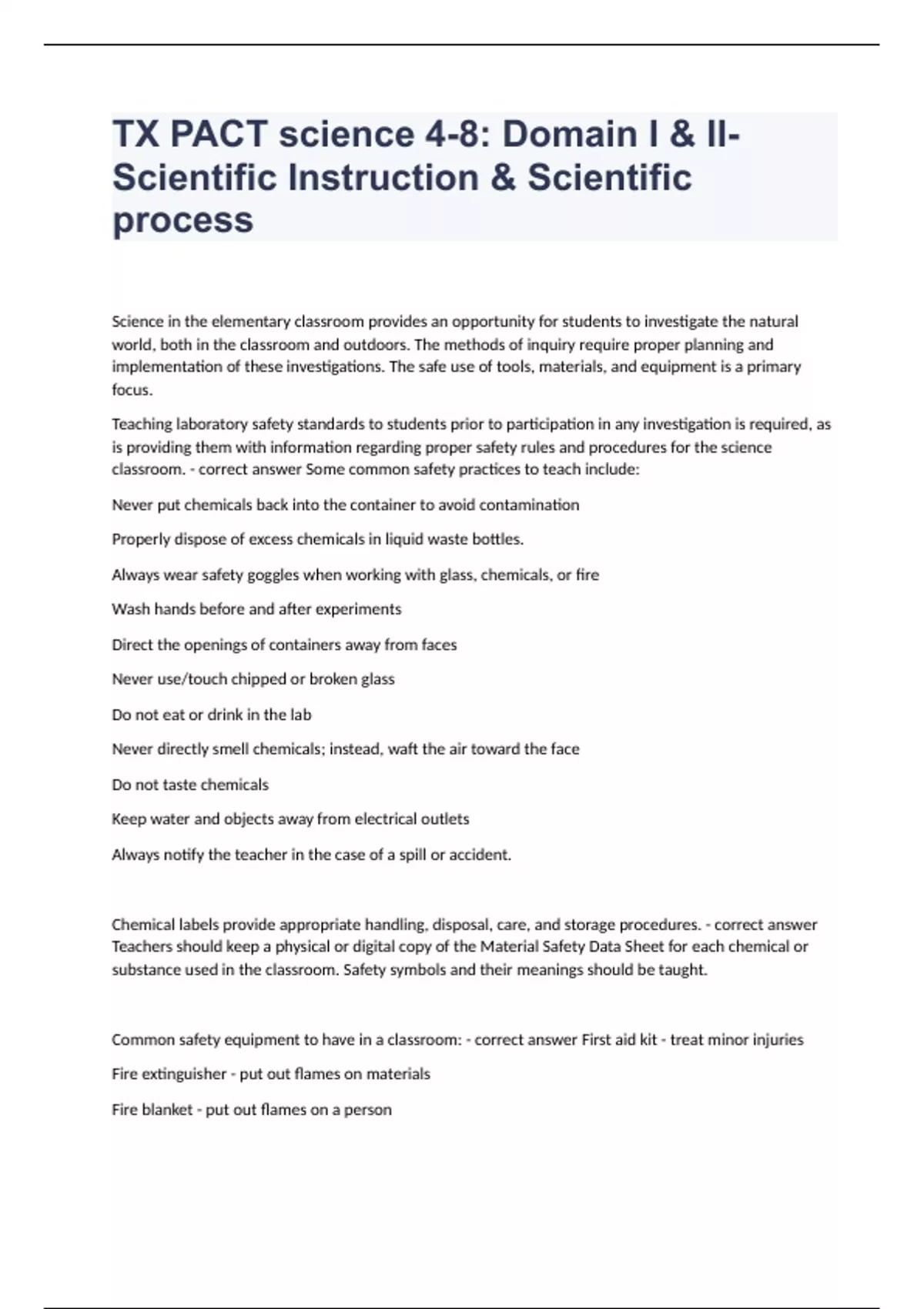 TX PACT science 4-8 Domain I & II- Scientific Instruction & Scientific processScience in the elementary classroom provides an opportunity for students to investigate the natural world, both in the classroom and outdoors. The methods of inquiry require proper planning and implementation of these investigations. The safe use of tools, materials, and equipment is a primary focus. Teaching laboratory safety standards to students prior to participation in any investigation is required, as is providing them with information regarding proper safety rules and procedures for the science classroom. - correct answer Some common safety practices to teach include: Never put chemicals back into the container to avoid contamination Properly dispose of excess chemicals in liquid waste bottles. Always wear safety goggles when working with glass, chemicals, or fire Wash hands before and after experiments Direct the openings of containers away from faces Never use/touch chipped or broken glass Do not eat or drink in the lab Never directly smell chemicals; instead, waft the air toward the face Do not taste chemicals Keep water and objects away from electrical outlets Always notify the teacher in the case of a spill or accident. Chemical labels provide appropriate handling, disposal, care, and storage procedures. - correct answer Teachers should keep a physical or digital copy of the Material Safety Data Sheet for each chemical or substance used in the classroom. Safety symbols and their meanings should be taught. Common safety equipment to have in a classroom: - correct answer First aid kit - treat minor injuries Fire extinguisher - put out flames on materials Fire blanket - put out flames on a person Goggles - protect eyes when using glassware or chemicals Fume hood - pulls chemical gasses up and away from people Body shower / Safety shower - wash chemical spills off a person Eyewash station - wash chemicals out of a person's eye Labeling Samples It is best practice to label all chemicals as follows: - correct answer 1. The compound name, written out in words 2. Who made the sample 3. The date the sample was made Hazards associated with the material Proper Handling of Specimens - correct answer When caring for and handling specimens and organisms, students should follow ethical and safety procedures and handle animals only when necessary. Classroom animals must meet safety requirements such as not being toxic or causing a danger to students. Classroom pet cages should be cleaned regularly with household bleach. Teachers should check for any students having allergies before choosing a classroom pet. Students should be taught to wash hands before and after any activity involving plants, animals, or soil. All microorganisms should be treated as pathogens. Disposal of non-carcinogenic or non-corrosive contaminants should be in a double-layered plastic bag and fastened securely with a wire tie. Proper Tool Use Students should choose the appropriate equipment to use in instructional activities. Some examples of appropriate equipment include: - correct answer a beaker, graduated cylinder, pipette, or Erlenmeyer flask to measure volume a metric ruler, meter stick, or metric tape measure to measure length a balance to measure mass a scale to measure weight a Celsius thermometer to measure temperature a stopwatch to measure time a computer to record data digitally teachers and students should understand that the use of a tool unsuitable to the task or improper tool use can cause inaccurate readings and corrupt data. For example, it is more accurate to use a graduated cylinder and water to take the volume of an irregularly-shaped object, rather than using a metric ruler to measure each dimension. Students should know the proper names and uses of laboratory tools, materials, and equipment including goggles, hand lenses, balances, magnets, timing devices, weather instruments, thermometers, rulers, beakers, spring scales, hot plate, test tubes, meter sticks, compasses, and microscopes. - correct answer Many tools need to be handled carefully to avoid damage. For example, microscopes should always be carried with two hands, with one hand on the base on one hand on the neck. Material Safety Data Sheet (MSDS) - correct answer a standardized information sheet for a substance; includes information about health risks, safe disposal and cleanup of spills, and environmental risks Waft - correct answer Wave the air toward the face. The safe way to smell a test tube. When students are conducting an experiment or investigation using glassware, which of the following is the most important piece of safety equipment for them to use? - correct answer Goggles would be the most important piece of safety equipment because of the potential for glass breaking and hurting the students' eyes. When examining the color and clarity of 1 gram of sugar in 30 milliliters of water, which of the following would be the best substitute for a test tube? - correct answer Graduated cylinders tend to be narrower than beakers and designed for accurately measuring small amounts of liquid. When is the best time to teach lab safety rules? - correct answer immediately before the students begin an experiment- Reminding students immediately before they begin using equipment is the best time because they can better remember and apply the specific safety rules to the specific equipment used during the experiment. Which of the following is a safe laboratory procedure? - correct answer Fume hoods are designed to increase airflow to remove fumes and protect any lab occupant from inhaling them. Volatile compounds are those that have a high vapor pressure at room temperature, which leads to their evaporation or sublimation into the gas phase. Many volatile compounds are quite toxic and can produce long-lasting health effects.