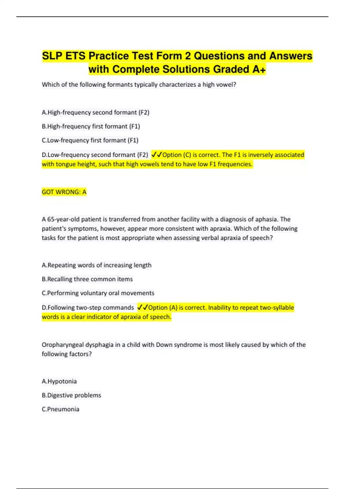 Which of the following formants typically characterizes a high vowel? A.High-frequency second formant (F2) B.High-frequency first formant (F1) C.Low-frequency first formant (F1) D.Low-frequency second formant (F2) Option (C) is correct. The F1 is inversely associated with tongue height, such that high vowels tend to have low F1 frequencies. GOT WRONG: A A 65-year-old patient is transferred from another facility with a diagnosis of aphasia. The patient's symptoms, however, appear more consistent with apraxia. Which of the following tasks for the patient is most appropriate when assessing verbal apraxia of speech? A.Repeating words of increasing length B.Recalling three common items C.Performing voluntary oral movements D.Following two-step commands Option (A) is correct. Inability to repeat two-syllable words is a clear indicator of apraxia of speech. Oropharyngeal dysphagia in a child with Down syndrome is most likely caused by which of the following factors? A.Hypotonia B.Digestive problems C.Pneumonia