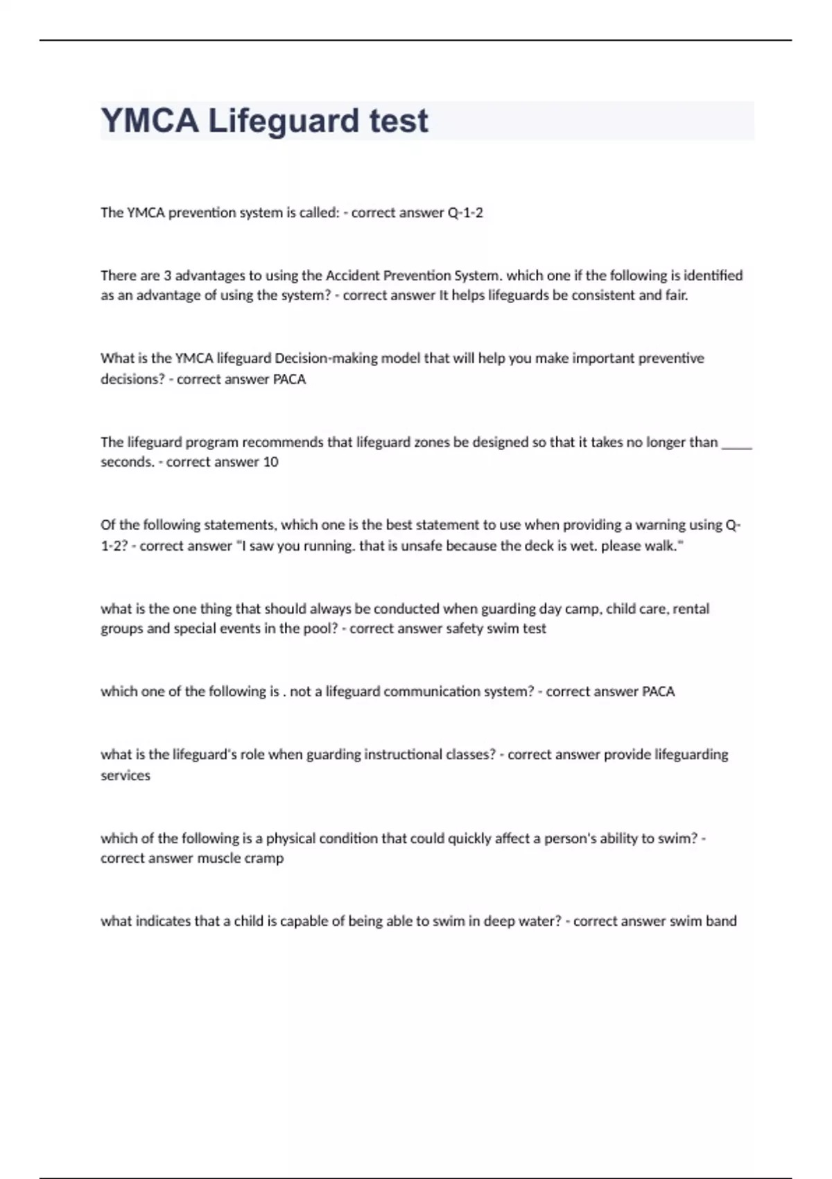 YMCA Lifeguard testThe YMCA prevention system is called: - correct answer Q-1-2 There are 3 advantages to using the Accident Prevention System. which one if the following is identified as an advantage of using the system? - correct answer It helps lifeguards be consistent and fair. What is the YMCA lifeguard Decision-making model that will help you make important preventive decisions? - correct answer PACA The lifeguard program recommends that lifeguard zones be designed so that it takes no longer than ____ seconds. - correct answer 10 Of the following statements, which one is the best statement to use when providing a warning using Q-1-2? - correct answer "I saw you running. that is unsafe because the deck is wet. please walk." what is the one thing that should always be conducted when guarding day camp, child care, rental groups and special events in the pool? - correct answer safety swim test which one of the following is . not a lifeguard communication system? - correct answer PACA what is the lifeguard's role when guarding instructional classes? - correct answer provide lifeguarding services which of the following is a physical condition that could quickly affect a person's ability to swim? - correct answer muscle cramp what indicates that a child is capable of being able to swim in deep water? - correct answer swim band which of the following is NOT a scanning strategy? - correct answer telling the other lifeguards what you see there are some positive techniques that lifeguards can use to remain vigilant and avoid fatigue. which of the following is the best combination of those techniques? - correct answer drink plenty of water, get a good night's sleep and periodically change body positions there are several behavioral and visual signs before patrons enter the water that lifeguards use to recognize potential victims. which of the following is one of those signs? - correct answer holding onto a small child swimmers at risk of becoming distressed may display: - correct answer early warning signs what is the technique used by YMCA lifeguards to ensure that systematic visual sweeps are conducted of the facility and patrons? - correct answer scanning how quickly can a person slip below the surface? - correct answer less than 20 seconds which of the following is NOT a characteristic of a distressed swimmer? - correct answer people using their cell phone to call 911 for help innattentional blindness is a term that refers ti: - correct answer when you fail to notice something happen right in front of you because you are focused intently on something else there are four stages in the drowning process. which of the following is NOT one of the four stages? - correct answer sleep apnea the fourth phase of the drowning process is cardiac arrest because the heart ceases to pump blood when deprived of oxygen. how long after the drowning process begins can this stage happen? - correct answer 3-5 minutes what are the primary responsibilities for lifeguard #1? - correct answer identifies the victim, activates the emergency action plan and begins the rescue