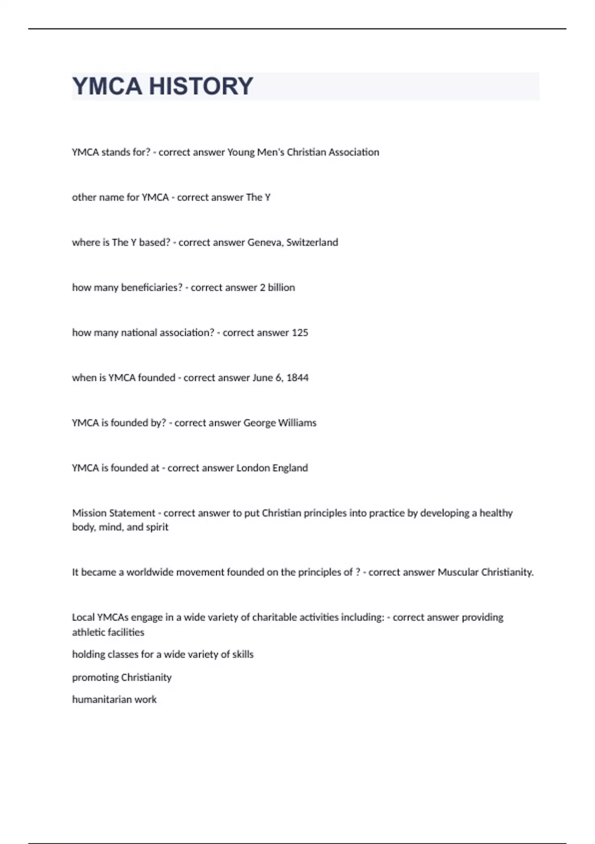 YMCA HISTORY questions n answers graded A+ 2023/2024