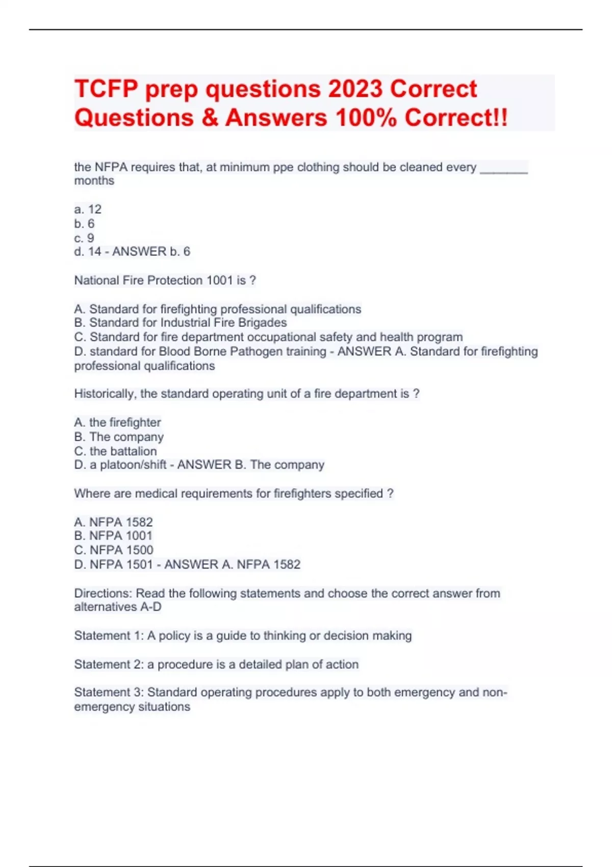 the NFPA requires that, at minimum ppe clothing should be cleaned every _______ months a. 12 b. 6 c. 9 d. 14 - ANSWER b. 6 National Fire Protection 1001 is ? A. Standard for firefighting professional qualifications B. Standard for Industrial Fire Brigades C. Standard for fire department occupational safety and health program D. standard for Blood Borne Pathogen training - ANSWER A. Standard for firefighting professional qualifications Historically, the standard operating unit of a fire department is ? A. the firefighter B. The company C. the battalion D. a platoon/shift - ANSWER B. The company Where are medical requirements for firefighters specified ? A. NFPA 1582 B. NFPA 1001 C. NFPA 1500 D. NFPA 1501 - ANSWER A. NFPA 1582 Directions: Read the following statements and choose the correct answer from alternatives A-D Statement 1: A policy is a guide to thinking or decision making Statement 2: a procedure is a detailed plan of action Statement 3: Standard operating procedures apply to both emergency and non-emergency situations A. st. 1 is true; st 2 and 3 are false B. st 1 and 2 are false; st 3 is true C. St 1 is false; st 2 and 3 are true D. all statements are true - ANSWER D. all statements are true Which is true regarding NFPA standards A. they are regarded as law B. they consensus documents C. they are adopted at the federal level D. they identify the maximum allowable by law. - ANSWER B. they consensus