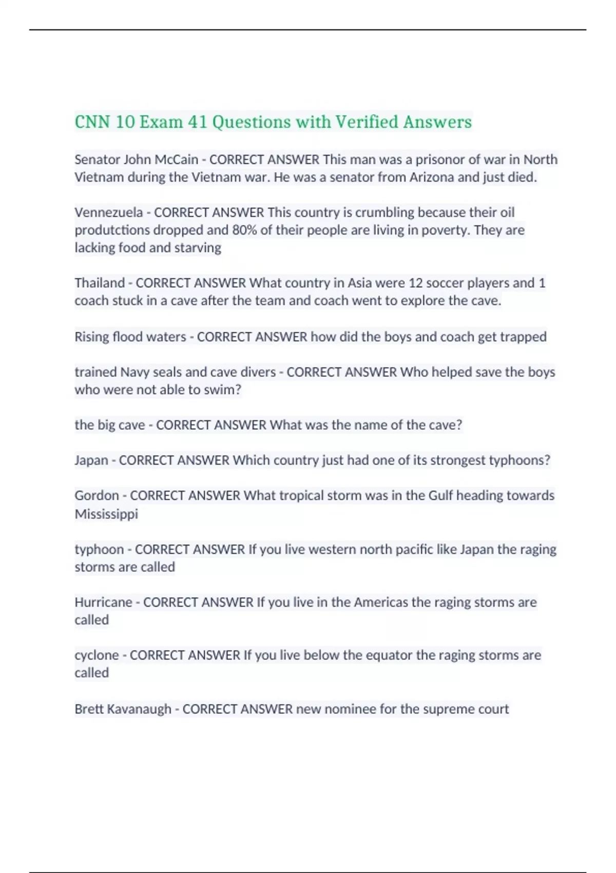 CNN 10 Exam 41 Questions with Verified Answers Senator John McCain - CORRECT ANSWER This man was a prisonor of war in North Vietnam during the Vietnam war. He was a senator from Arizona and just died. Vennezuela - CORRECT ANSWER This country is crumbling because their oil produtctions dropped and 80% of their people are living in poverty. They are lacking food and starving Thailand - CORRECT ANSWER What country in Asia were 12 soccer players and 1 coach stuck in a cave after the team and coach went to explore the cave. Rising flood waters - CORRECT ANSWER how did the boys and coach get trapped trained Navy seals and cave divers - CORRECT ANSWER Who helped save the boys who were not able to swim? the big cave - CORRECT ANSWER What was the name of the cave? Japan - CORRECT ANSWER Which country just had one of its strongest typhoons? Gordon - CORRECT ANSWER What tropical storm was in the Gulf heading towards Mississippi typhoon - CORRECT ANSWER If you live western north pacific like Japan the raging storms are called Hurricane - CORRECT ANSWER If you live in the Americas the raging storms are called cyclone - CORRECT ANSWER If you live below the equator the raging storms are called Brett Kavanaugh - CORRECT ANSWER new nominee for the supreme court Botswana - CORRECT ANSWER Which country in Africa has the largest elephant population? They want their tusks to sell for money - CORRECT ANSWER Why are they poaching the elephants? Golden Retriever - CORRECT ANSWER who's the major of Idyllwild,Ca September 11 - CORRECT ANSWER What was the date of the attack on the US where planes were hijacked and flown into the twin towers, the pentagon and a field in Shanksville, PA? Flight 93 - CORRECT ANSWER What was the name of the flight that crashed into a field in Shanksville, PA? Florence - CORRECT ANSWER The name of the category 4 hurricane approaching the North and South Carolina coast The hurricane that could dump 10 trillion of water on North Carolina? It has winds up to 140 miles an a hour Macaw - CORRECT ANSWER Name of the birds that are going extinct in their habitat Shanksville, PA Flight 93 memorial - CORRECT ANSWER Where did President Trump visit on Sept 11? Pluto - CORRECT ANSWER Which planet are they arguing on if it is a planet or not? Philippines - CORRECT ANSWER Mangkhut is the name of the typhoon that hit which country? Alyssa Montantee - CORRECT ANSWER She is the Cnn hero of the week She says love is universal . She helps people who are missing arms and legs get the help they need. Most of the migrants in a caravan that's been advancing through Central and North America are from what country? - CORRECT ANSWER Honduras According to a recent survey by the NRF, Americans are expected to spend $9 billion on what event? - CORRECT ANSWER Halloween Today, the Intermediate-Range Nuclear Forces Treaty exists between the U.S. and Russia. With what nation did the U.S. sign the agreement in 1987? - CORRECT ANSWER Soviet Union What is the name of the major hurricane that made landfall in western Mexico this week? - CORRECT ANSWER Hurricane Willa Name two of the three places connected by the longest sea-crossing bridge on Earth, which opened for the first time on Wednesday? - CORRECT ANSWER Hong Kong and Macau What U.S. government agency is asking help in its investigation of a series of suspicious packages to prominent Democrats, a former CIA director, and an actor? - CORRECT ANSWER FBI Several of the suspicious packages discussed in question 6 contained a return address from a U.S. congresswoman's office in what state? - CORRECT ANSWER Florida U.S. Adm. James Fogo, the commander of American naval forces of Europe, says his concerns about Russia focus on what type of military vehicle? - CORRECT ANSWER submarines Jamal Khashoggi, a journalist whose disappearance sent ripple effects around the world, is originally from what country? - CORRECT ANSWER Saudi Arabia Andrew Brunson, a pastor who was released after spending more than two years in Turkish prison, is originally from what country? - CORRECT ANSWER U.S. Name one of the two countries that are connected by the world's longest, non-stop passenger flight, which takes around 18 hours to cover more than 10,000 miles. - CORRECT ANSWER U.S. and Singapore Name the specific part of the Florida Panhandle (a beach) that appears to have borne the brunt of Hurricane Michael. - CORRECT ANSWER Mexico Beach What U.S. retail company, which was founded in 1893, is part of a bankruptcy filing that will cause more store closings, though it hopes to stay in business? - CORRECT ANSWER Sears What U.S. university is involved in a lawsuit that accuses it of discriminating Asian-Americans, a charge the institution denies? - CORRECT ANSWER Harvard In what body of water has the Ocean Cleanup Team released a 2,000 foot-long pipe in the hopes that it can help remove plastic from the sea? - CORRECT ANSWER Great Pacific Garbage Patch Name the Central African nation where the fight against Ebola has been complicated by armed conflict in the region - CORRECT ANSWER Democratic Republic of Congo In a new report concerning antibiotics in the food supply, 22 out of 25 hamburger chains received what grade? - CORRECT ANSWER F Name the political and military alliance that is conducting military exercises as Russia appears to be bolstering its military installations in Kaliningrad. - CORRECT ANSWER NATO