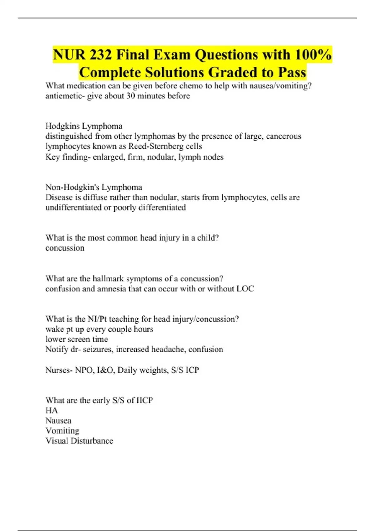 NUR 232 Final Exam Questions with 100% Complete Solutions Graded to Pass