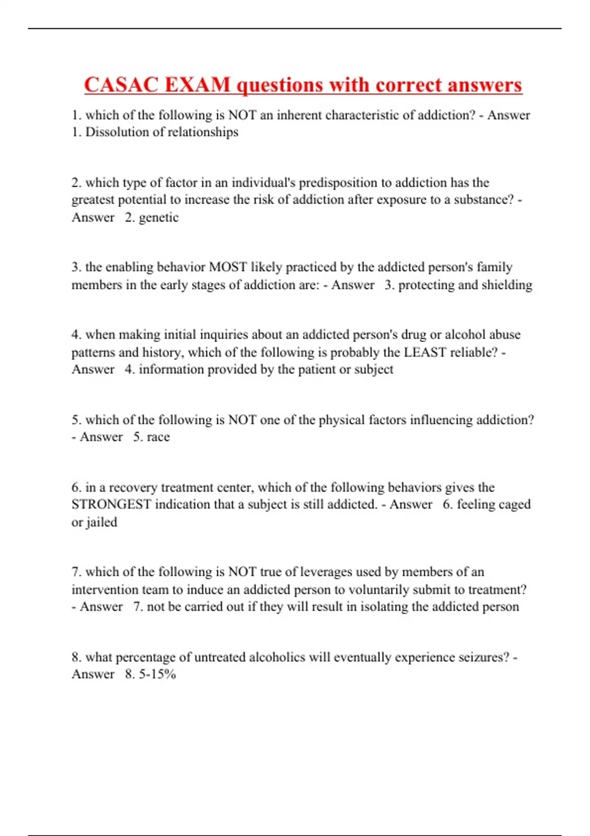 1. which of the following is NOT an inherent characteristic of addiction? - Answer 1. Dissolution of relationships 2. which type of factor in an individual's predisposition to addiction has the greatest potential to increase the risk of addiction after exposure to a substance? - Answer 2. genetic 3. the enabling behavior MOST likely practiced by the addicted person's family members in the early stages of addiction are: - Answer 3. protecting and shielding 4. when making initial inquiries about an addicted person's drug or alcohol abuse patterns and history, which of the following is probably the LEAST reliable? - Answer 4. information provided by the patient or subject 5. which of the following is NOT one of the physical factors influencing addiction? - Answer 5. race 6. in a recovery treatment center, which of the following behaviors gives the STRONGEST indication that a subject is still addicted. - Answer 6. feeling caged or jailed 7. which of the following is NOT true of leverages used by members of an intervention team to induce an addicted person to voluntarily submit to treatment? - Answer 7. not be carried out if they will result in isolating the addicted person 8. what percentage of untreated alcoholics will eventually experience seizures? - Answer 8. 5-15% 9. which of the following is a sign that an ad